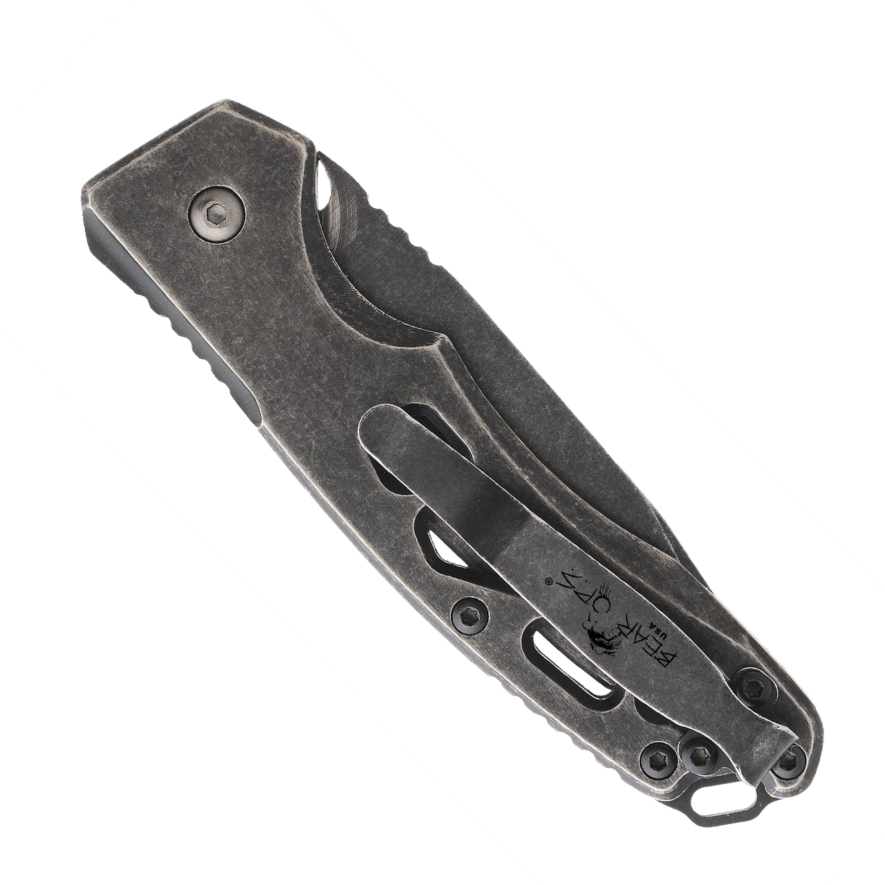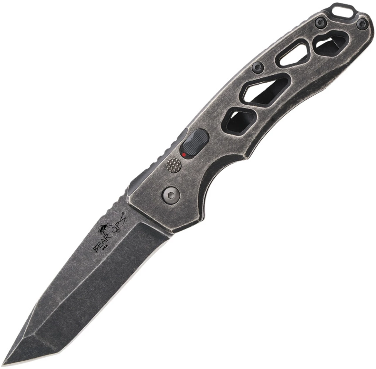The Bear Ops AC-1200-Ti-SW is part of the Bold Action® XII series. The Modified Drop Point Bold Action® XII pattern features a Hollow Ground 2-7/8” blade edge that is made with 154CM Premium Steel, allowing this auto to be corrosion resistant and tough with a great edge retention. The blade opens with a firm push of the recess button and a safety is present to prevent accidental deployment. The Titanium Stonewash 4″ Handle features a Pocket Clip that provides for tip-up carry and quick access. The Bear Ops AC-1200-Ti-SW features jimping on the top of the blade and handle and an index finger groove for a more secure grip. A lanyard spacer is also present for fastening and secure storage. The Bear Ops AC-1200-Ti-SW has an overall length of 6-7/8″ and weighs only 2.8 ounces due to its skeletonized design. Bold Action® XII is proudly made in the USA.