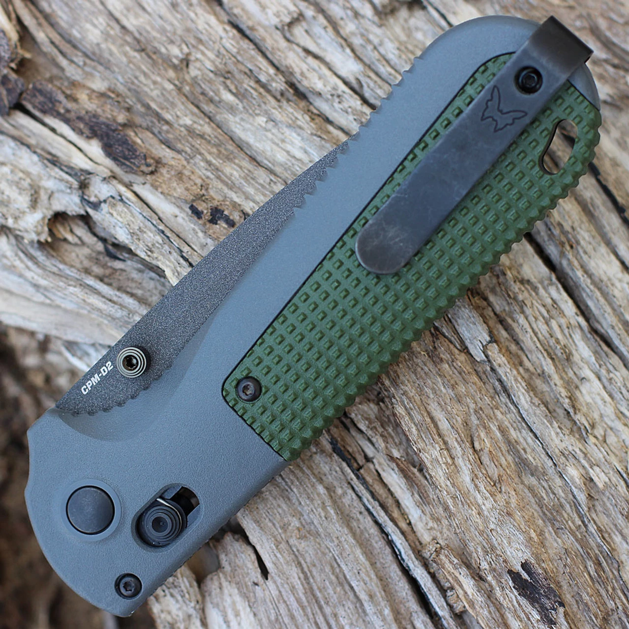 Benchmade Redoubt (430SBK) – 3.55″ CPM-D2 Black Cobolt Part Serrated Drop Point, Gray/Green Grivory Handle