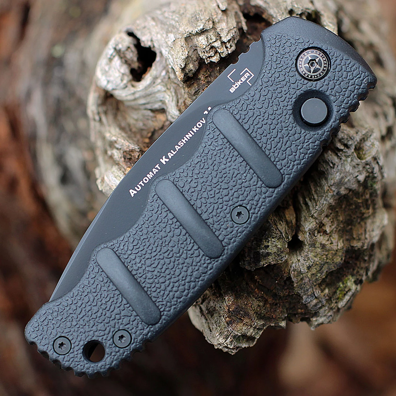 The Boker Kalashnikov 74 automatic is a great budget friendly option as an entry point to the world of automatic knives. The flat ground blade deploys fast and smooth via the button lock operation and the aluminum handles are grooved for comfort and security.The Blade Made from D2, the fully flat ground blade is thin for excellent slicing and is corrosion resistant and easy to sharpen.