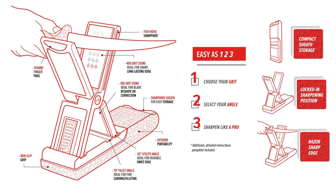 The Altus Knife Sharpener provides the means to maintain and prepare your blades easily on the go. The double-sided folding stone has two grits; 180 and 400, and switching between them is quick and easy. The bottom of the base has a non-slip covering that secures the system in place during use. The stones can be folded up and slotted smoothly into the base, turning this sharpener into a very convenient and portable solution.