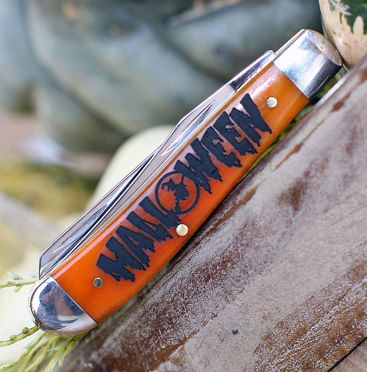 The Case Halloween Persimmon Orange Smooth Bone Mini Trapper features Tru-Sharp surgical steel mirror polished clip point and spey blades with nail pulls, the clip point blade is partially serrated. The handles are persimmon orange smooth bone with a laser embellishment, nickel silver bolsters, and brass pins and liners.