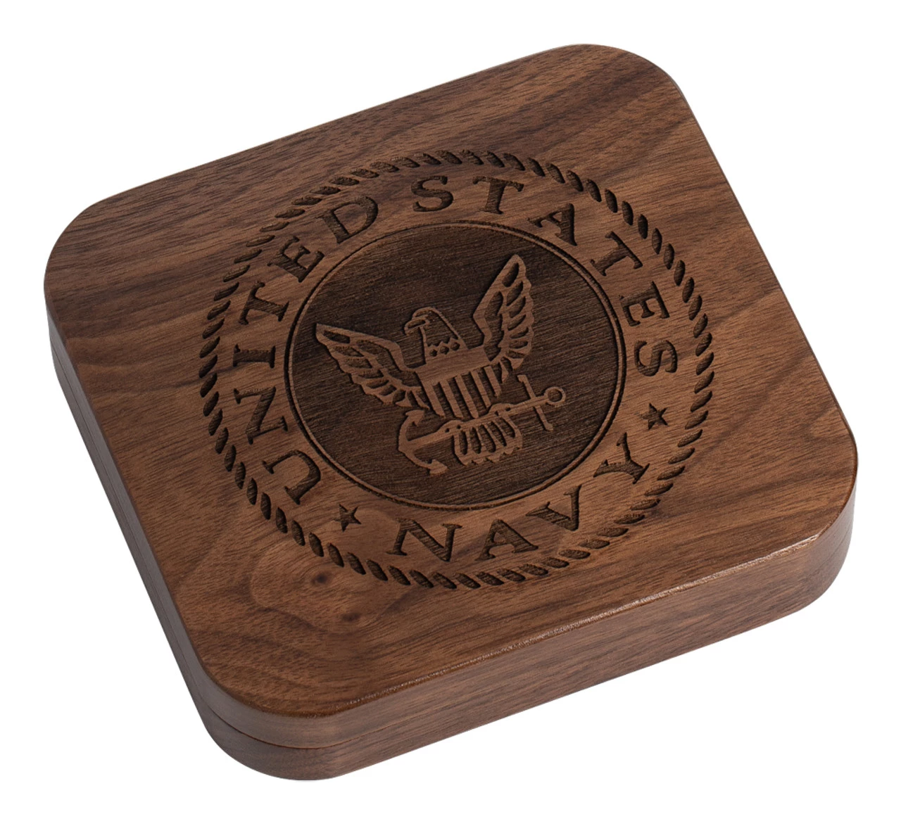 U.S. Navy Gift Set – Embellished Smooth Natural Bone Trapper (6254 SS) w/ Blue Color Wash/Ambered/ Black Definition – Embellished Wooden Box