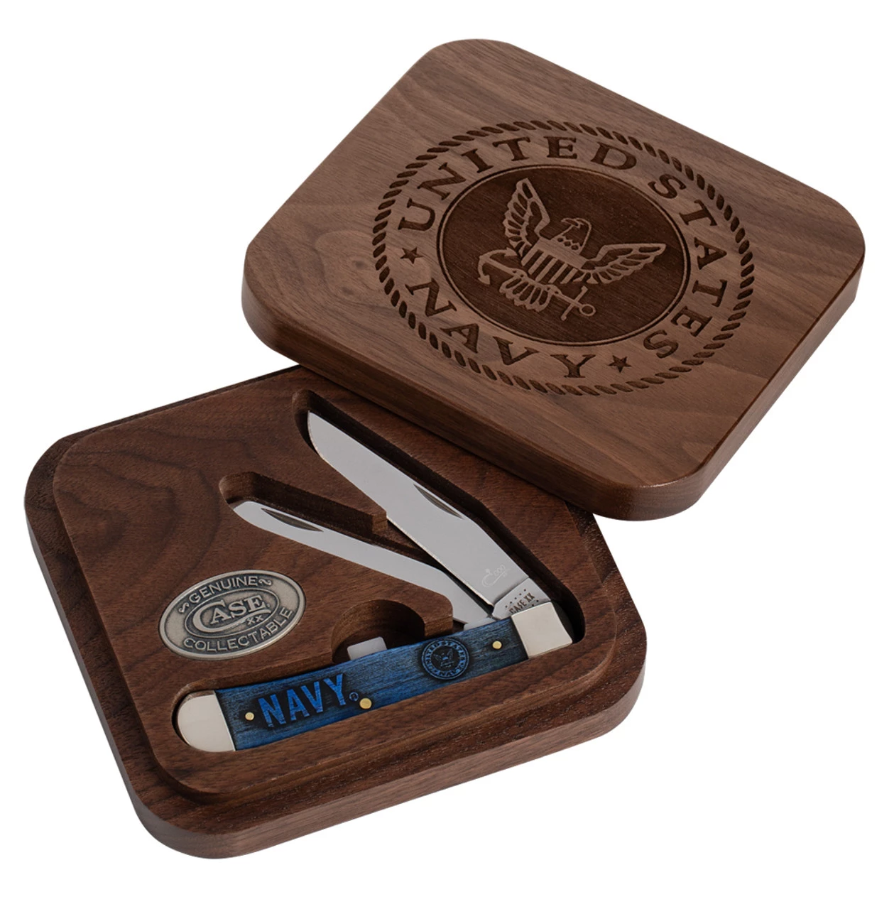 Case Trapper 17726 U.S. Navy Gift Set Embellished Smooth Natural Bone w/ Blue Color Wash (6254 SS) Embellished Wooden Box