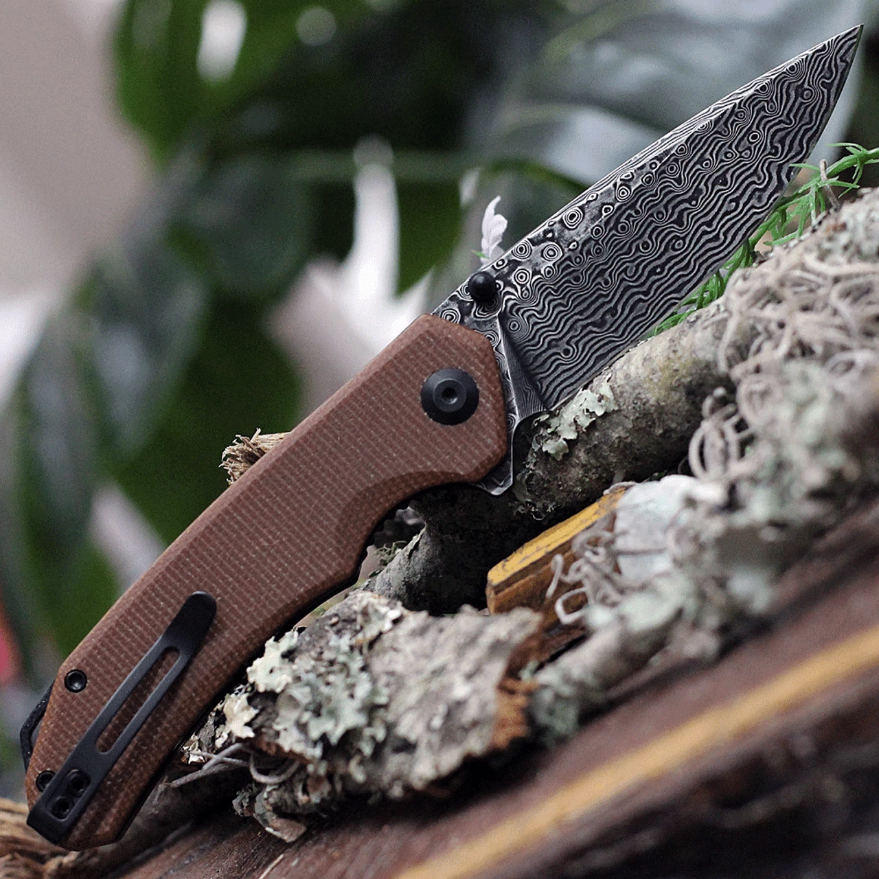 CIVIVI Brazen Flipper Knife C2102DS-1, 3.46″ Damascus Blade, Brown Micarta Handle