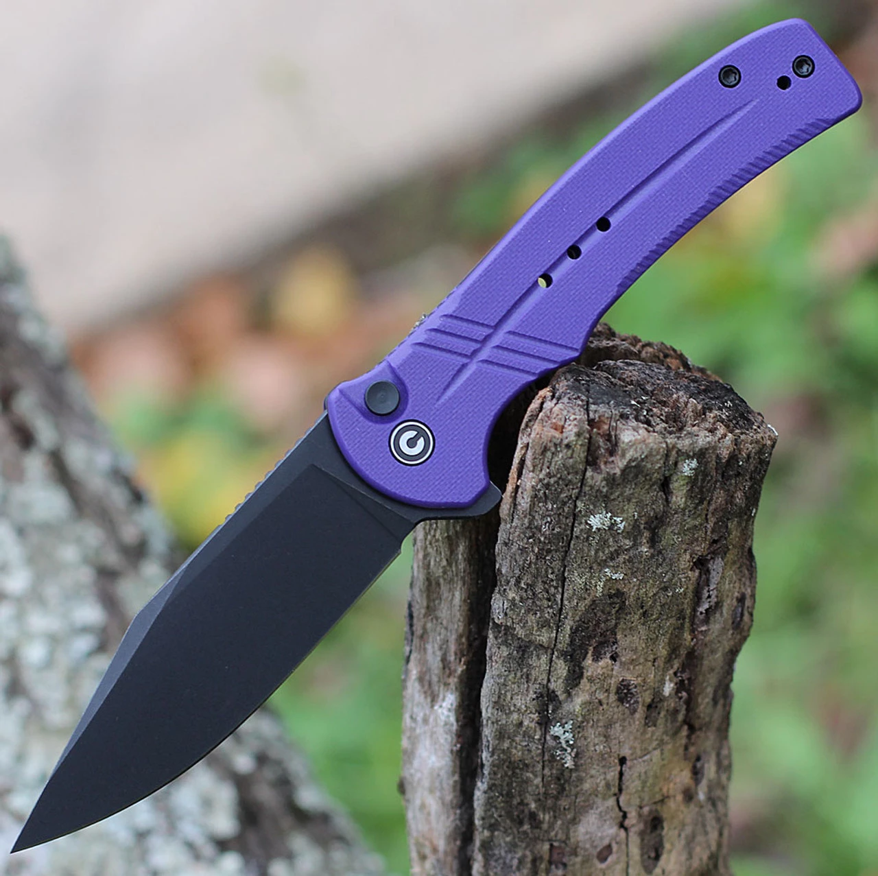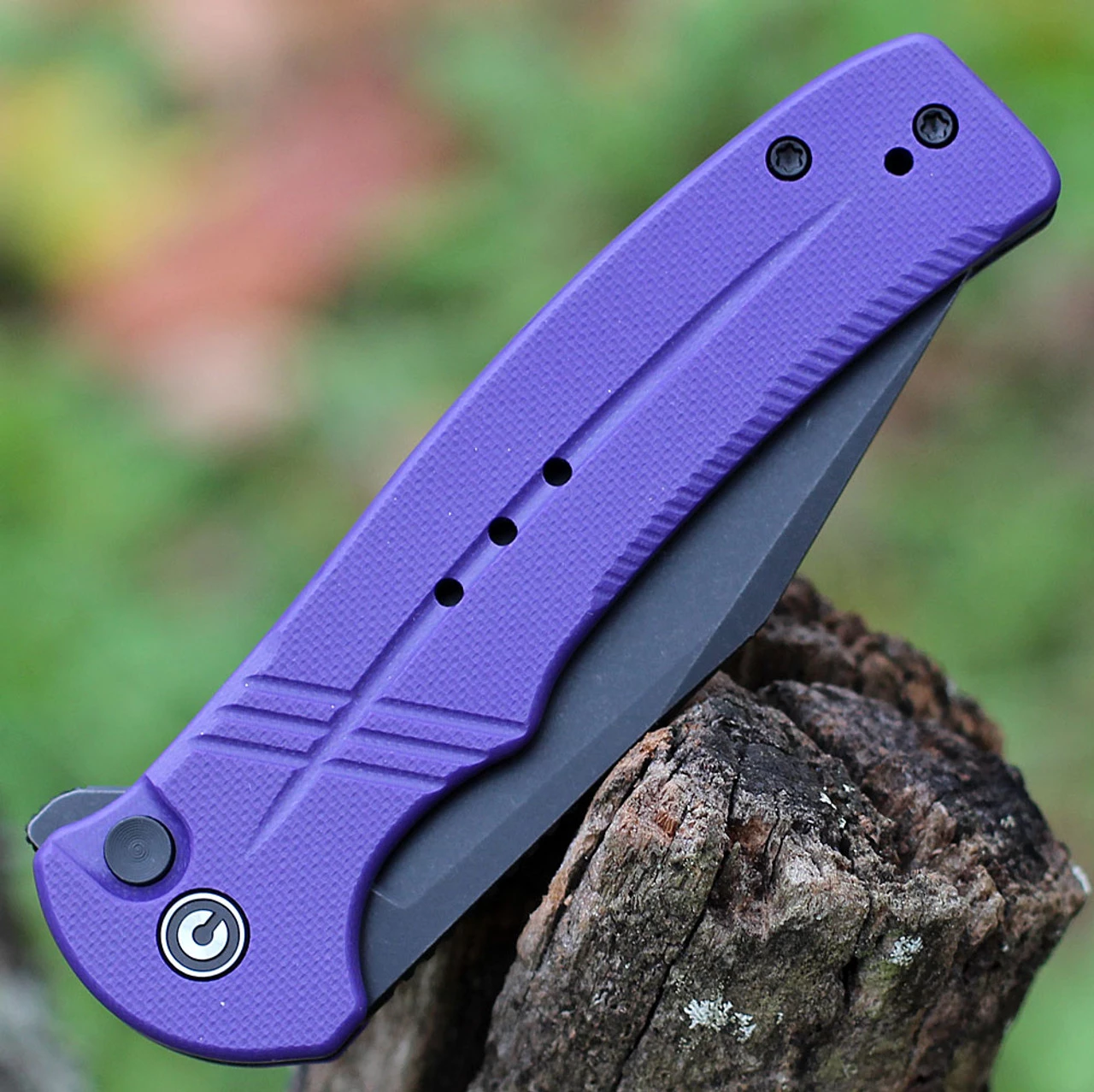 CIVIVI Cogent Button Lock (C20038D-2) – 3.47″ 14C28N Black Stonewashed Plain Blade, Purple G10 Handle