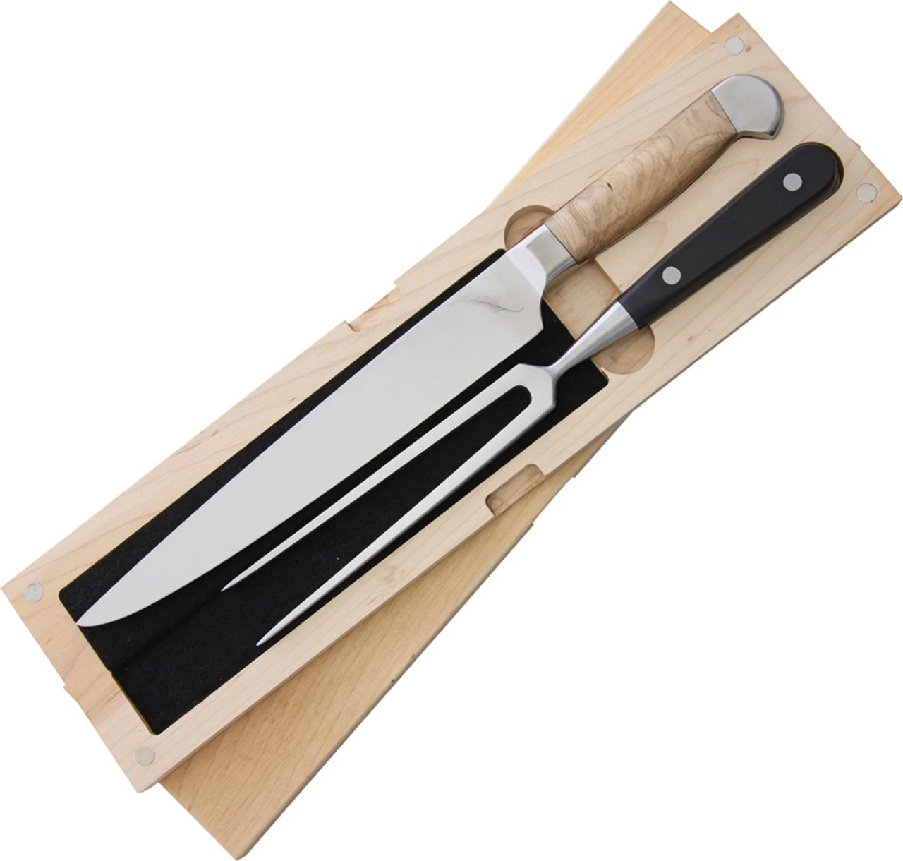 This set includes overall carving with 6.25″ stainless fork Black synthetic handle. Wooden gift box.