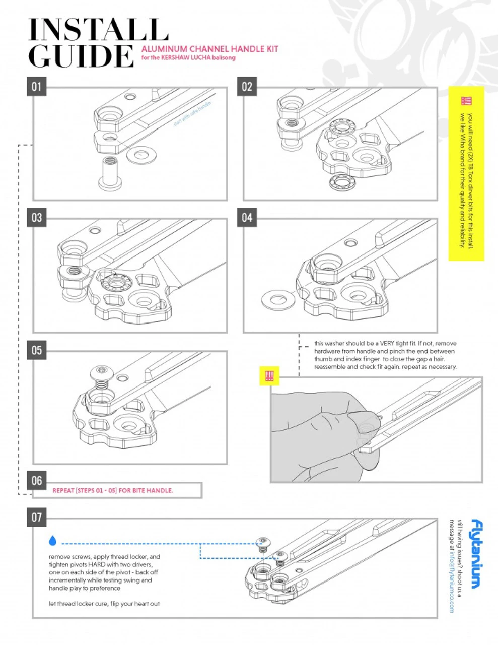 The Aluminum Version 1.5 Channel Handle Kit features 6061 hard coat anodized aluminum is the perfect upgrade for your Lucha Balisong. Flytanium has smoothed out the sharp edges and dialed in the milling for better fitment. The handles are optimized for better balance, with a bit of added girth and length. Also added jimping for improved laddering while flipping. Stainless steel washers are included to set into the aluminum so your bearings are riding against steel for that smooth action. This model features a latchless design.