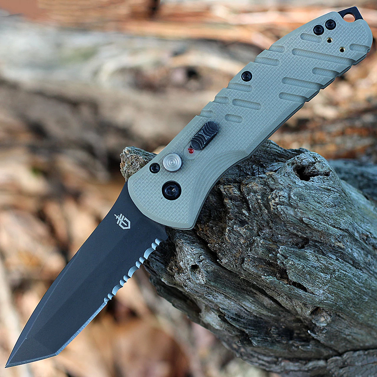 Gerber Propel Downrange Auto (30-000717) – 3.5″ CPM-S30V Black Oxide Coated Part Serrated Blade, Desert Tan G-10 Handle