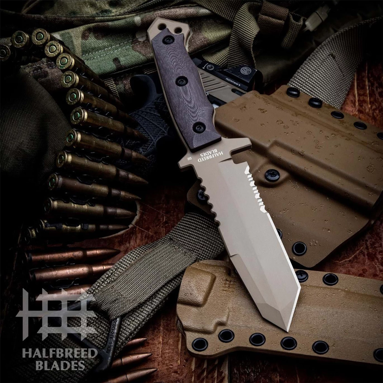 Halfbreed MIK-02 Medium Infantry Knife (MIK-02 DE) – 5.31″ D2 Tan Partially Serrated Tanto Blade, Dark Earth G10 Handle, Tan Molded Kydex SheathÂ