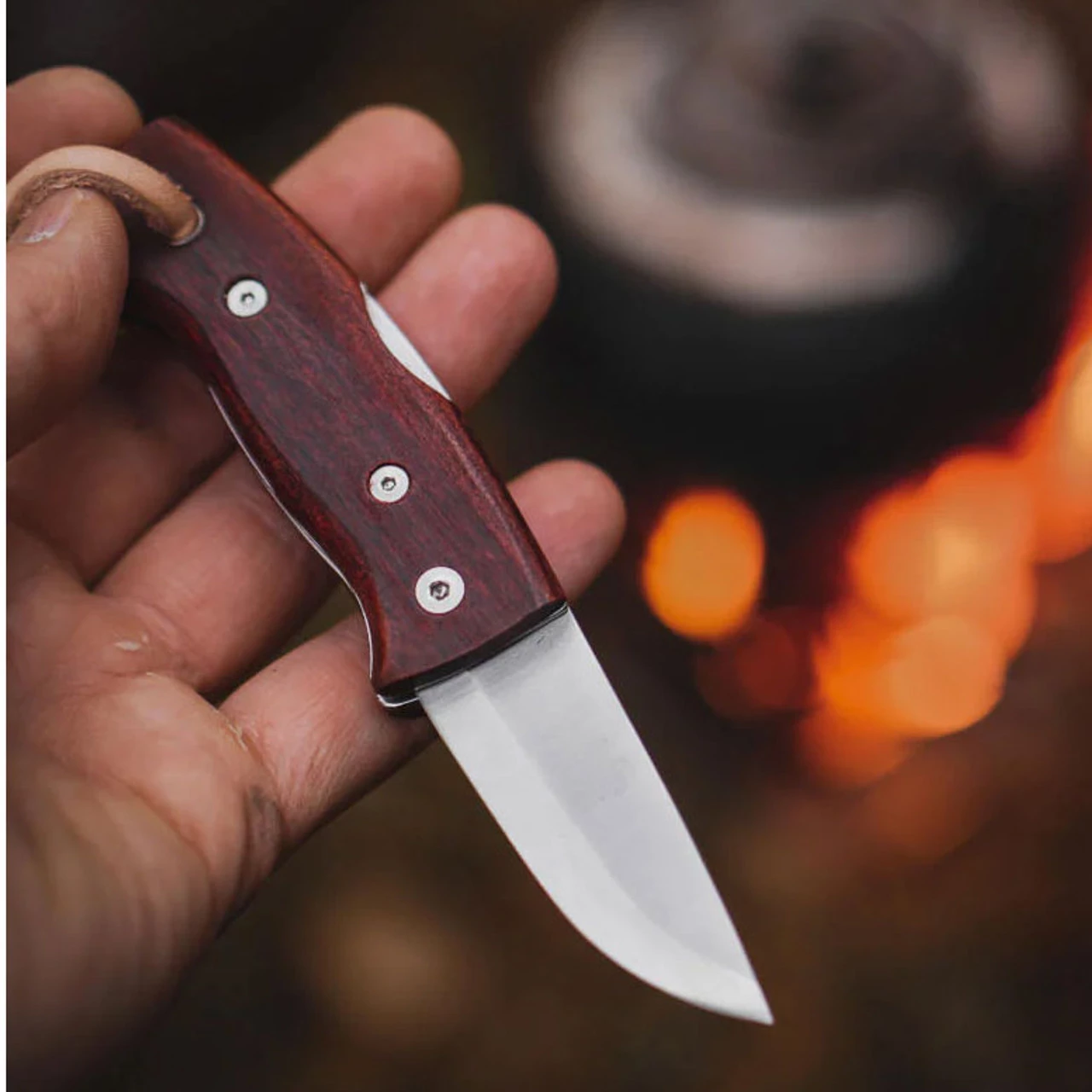 The Raud combines light weight with sturdy construction and a 0.10″ thick blade. Small enough for pocket carry, but big enough for real work. For normal hands, the deep oiled, red birch handle is just big enough for a three-finger grip.