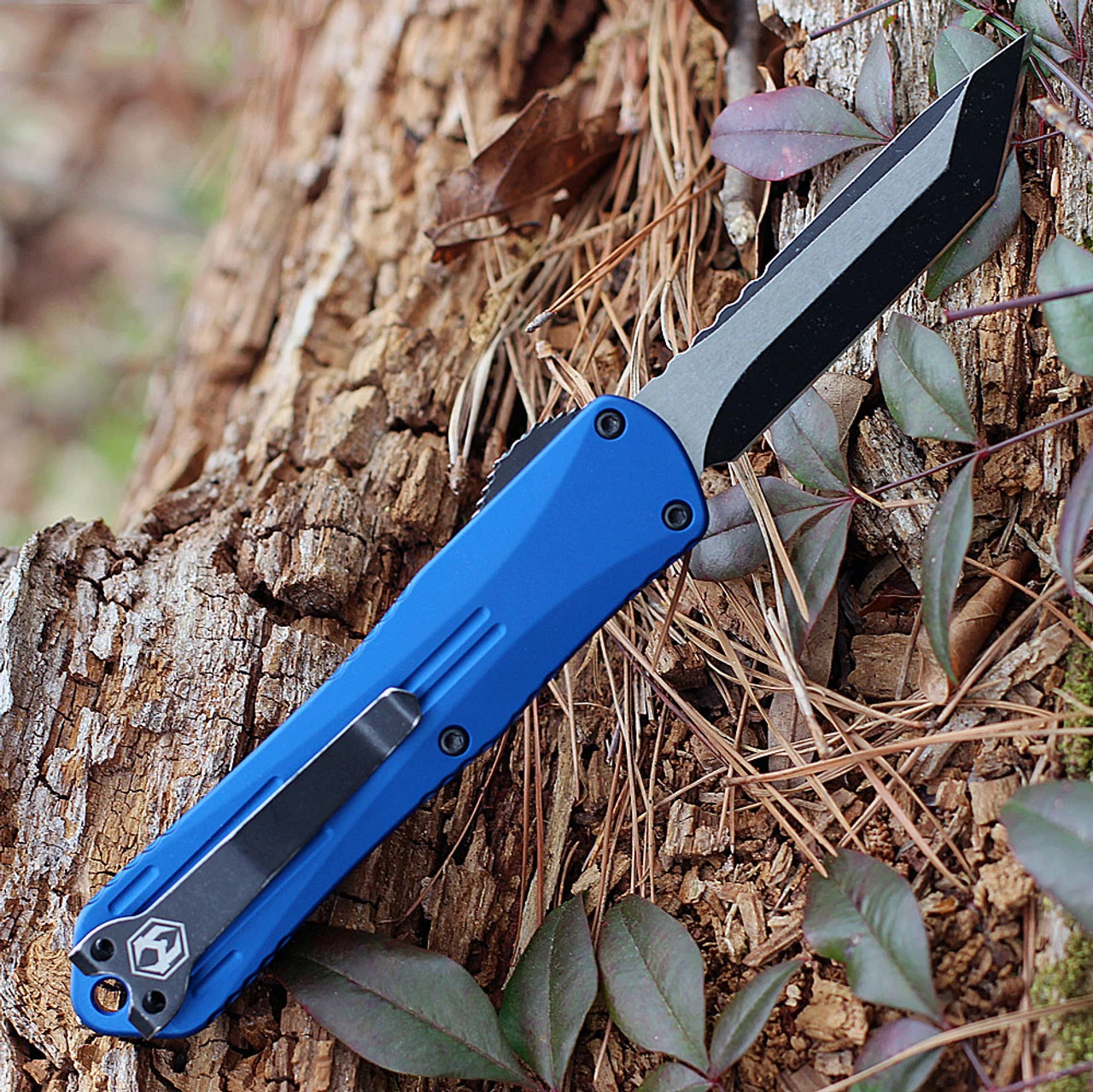 Heretic Knives Manticore E OTF (Out-the-Front) Automatic (H027-8A-BLU) – 3.19″ Elmax Battleworn Black Tanto Blade, Blue AluminumÂ