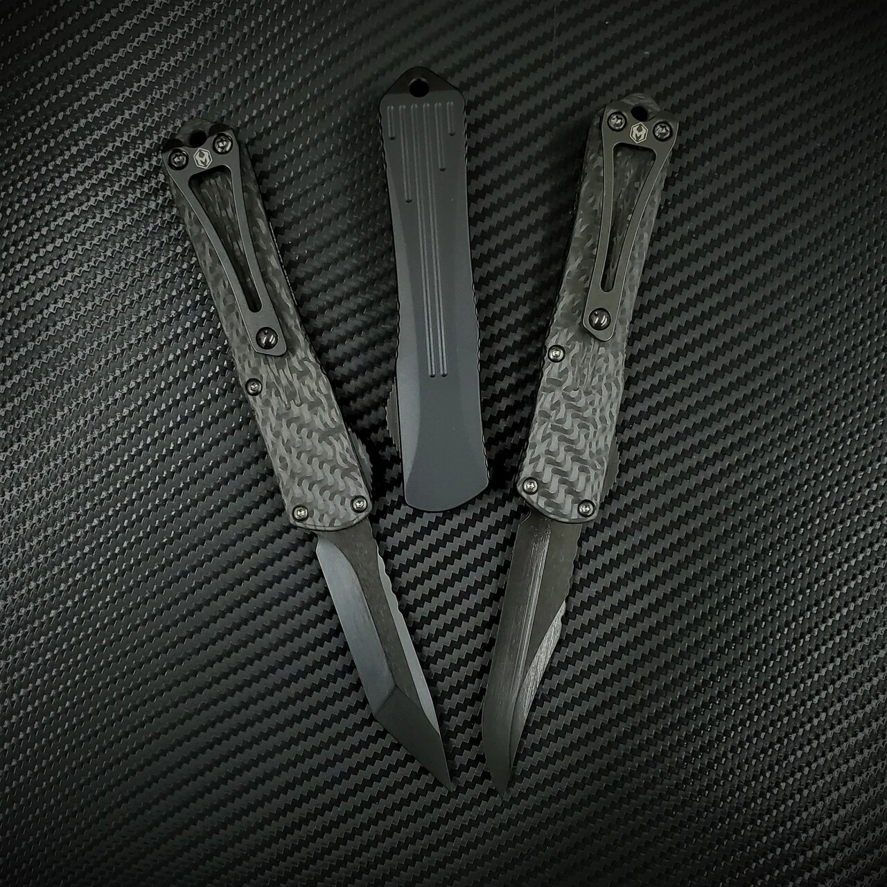 Heretic Manticore S OTF Automatic (H022B-6A-CF) – 2.62″ ELMAX DLC Bowie Blade, Black Aluminum Handle with Carbon Fiber Backcover, DLC Hardware and Button, Titanium Clip