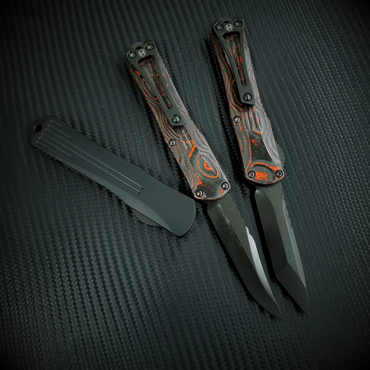Heretic Manticore S OTF Automatic (H022B-6A-ORCF) – 2.62″ ELMAX DLC Bowie Blade, Black Aluminum Handle with Orange Camo Carbon Fiber Back Cover, DLC Hardware and Button, Titanium Clip
