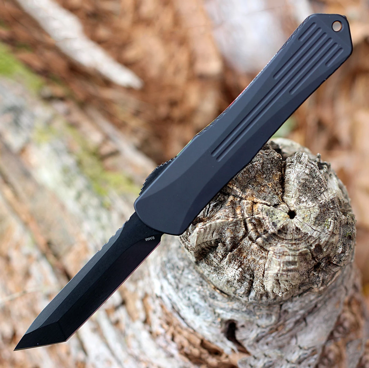 Heretic Manticore X OTF Automatic (H031-6A-CF80’s) – 3.7″ Elmax Black DLC Tanto Blade, Awesome 80’s Carbon Fiber Backcover and Black Aluminum Front Handle