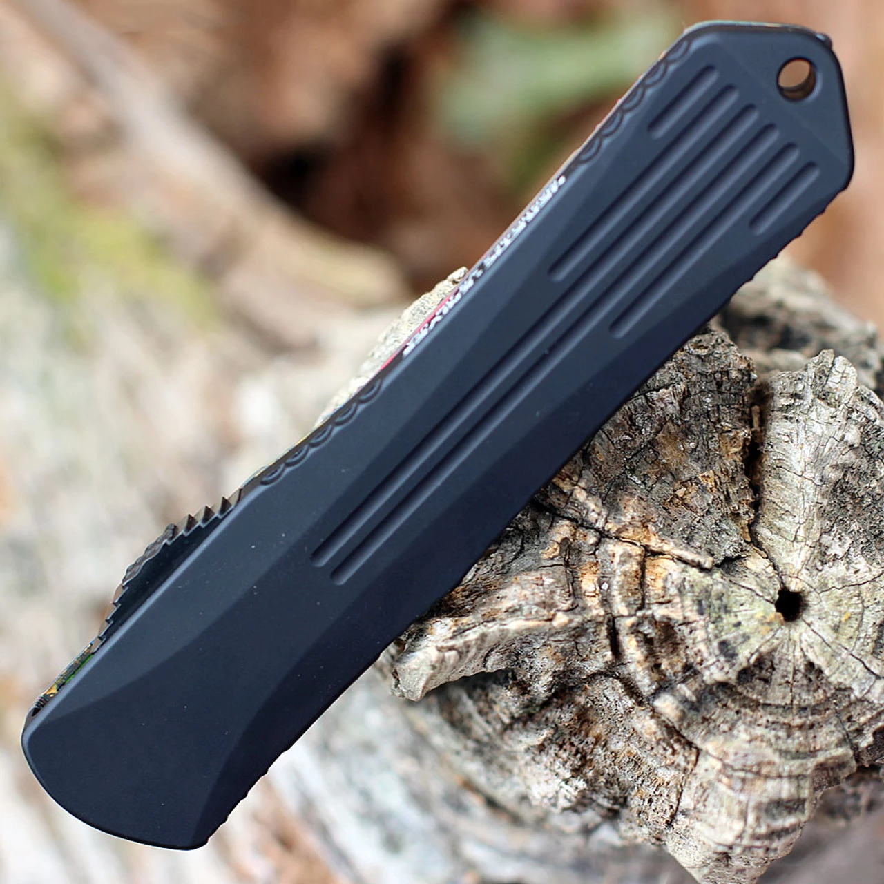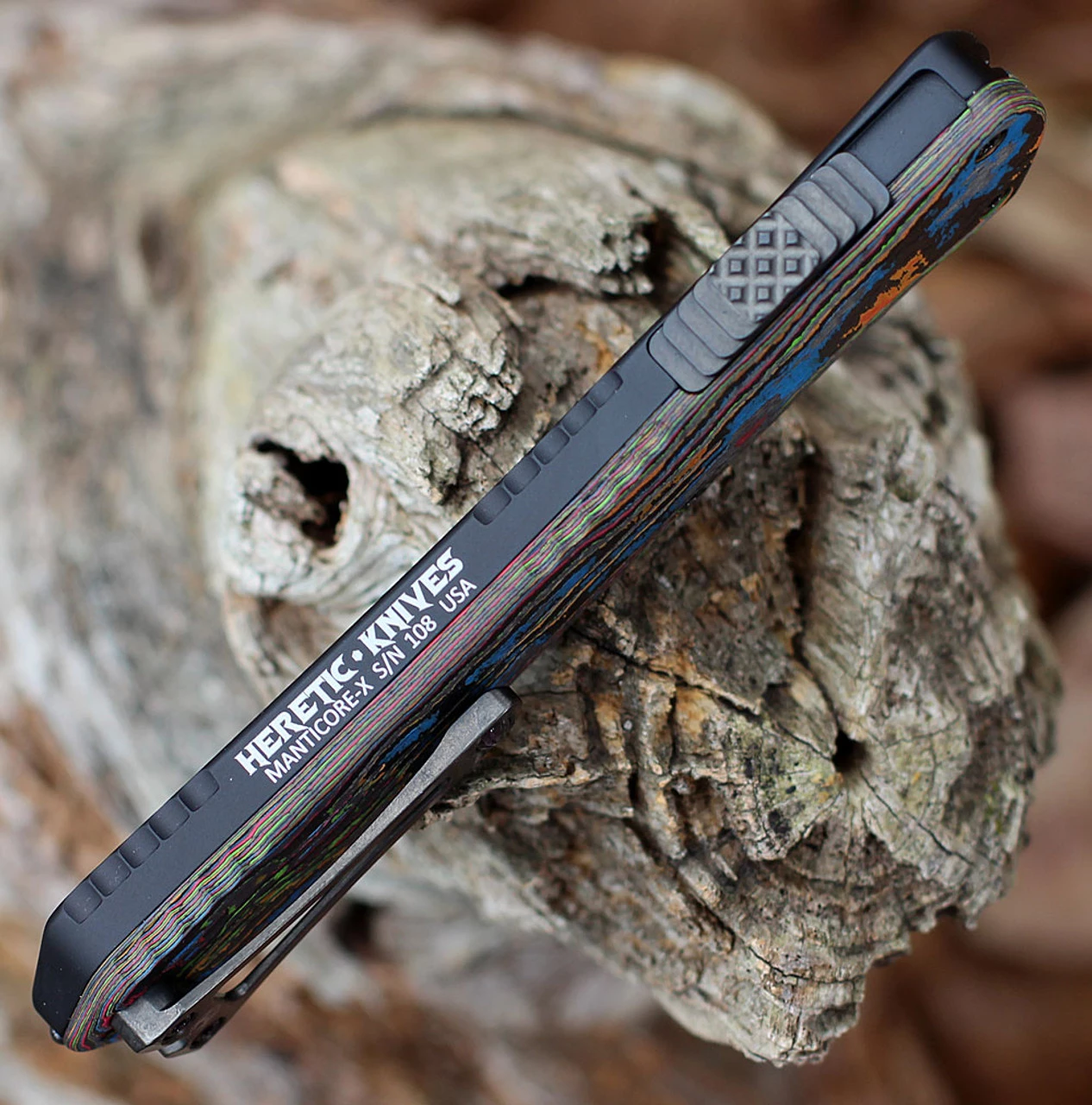 The Manticore X is a double action out-the-front (OTF) automatic knife, the blade can be deploued and retracted with one hand. The knife’s smooth action starts with a stepped thumb slide so you are able to fire the blade with confidence. Elegant sweeping lines and jimping down the length of the handle add depth to an otherwise smooth body. A hardened steel glass breaker rounds out the handle.