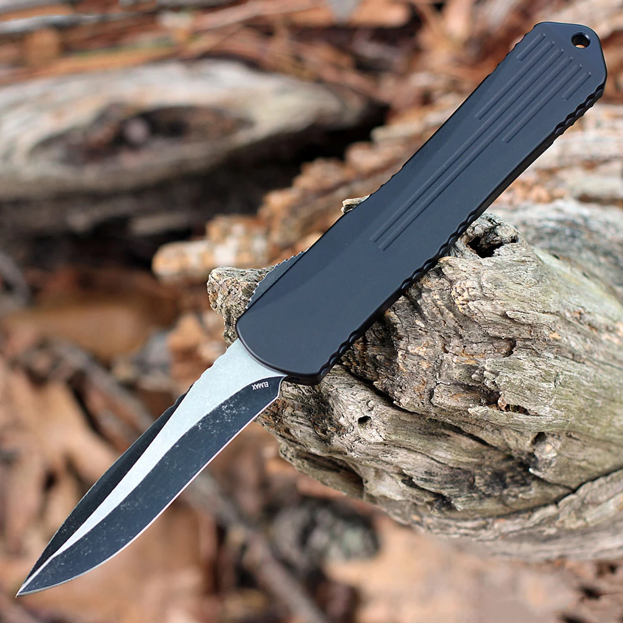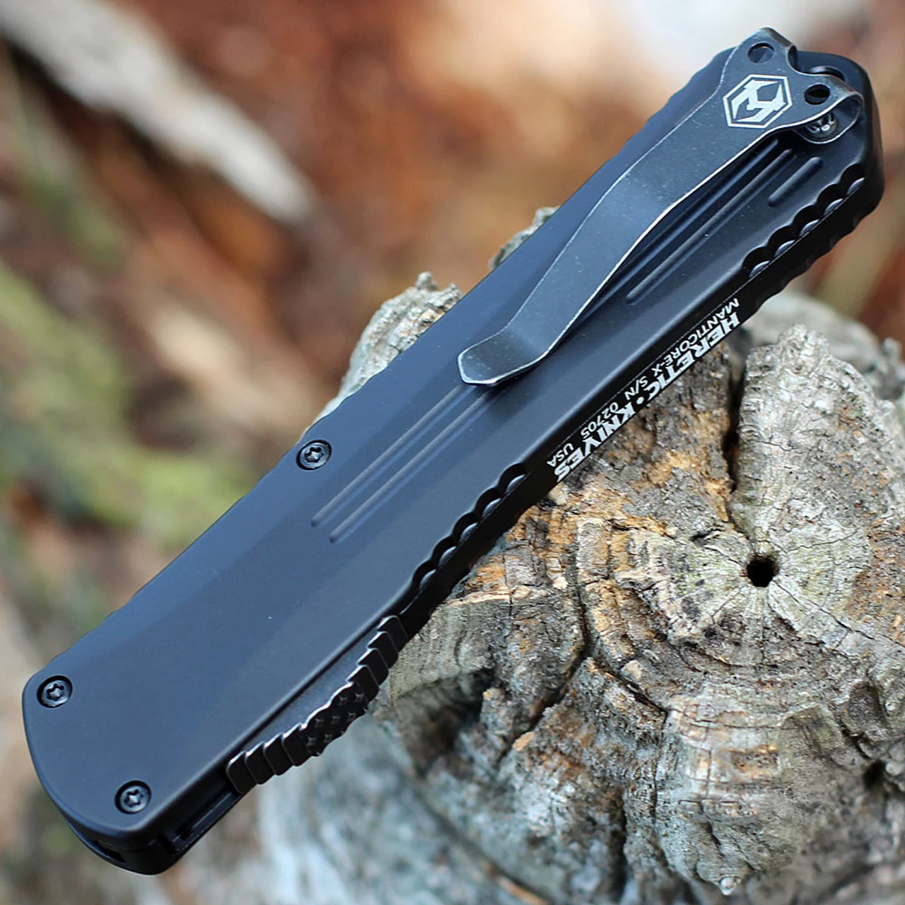 Heretic Manticore X OTF Double Action Automatic (H033-8A) – 3.7″ ELMAX Two-Tonme Battleworn Black Recurve Blade, Black Aluminum Handle, Battleworn Black Hardware