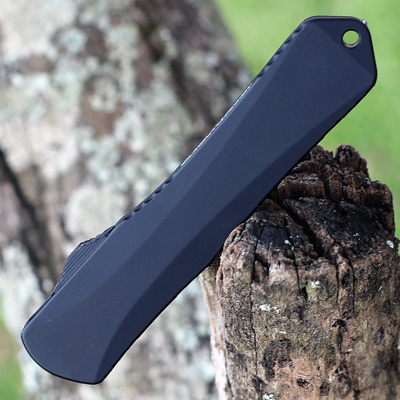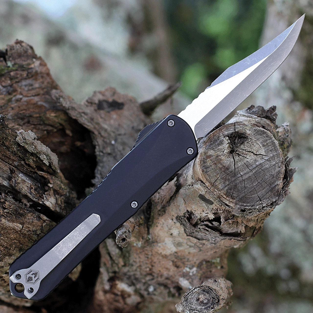 The Manticore X is a double action out-the-front (OTF) automatic knife, the blade can be deploued and retracted with one hand. The knife’s smooth action starts with a stepped thumb slide so you are able to fire the blade with confidence.Ā Elegant sweeping lines and jimping down the length of the handle add depth to an otherwise smooth body. A hardened steel glass breaker rounds out the handle.Ā