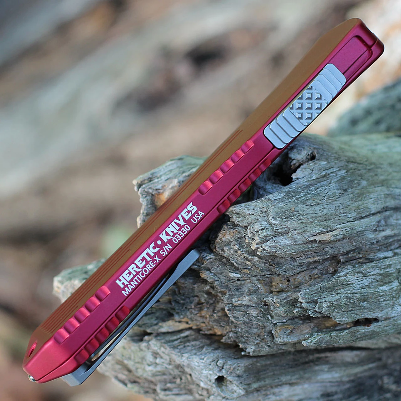 The handle of this super smooth Manticore X from Heretic Knives features the classic Red 6061-T6 Aluminum cover with the new milling on the handle.