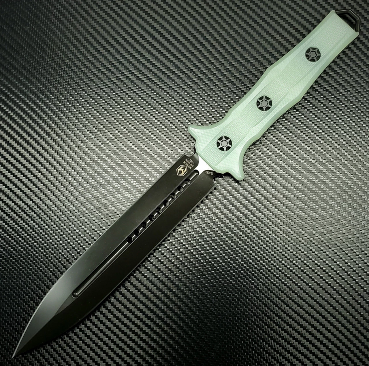 Heretic Knives Nephilim Fixed Blade (H003-6A-JADE) – 6.5″ Elmax DLC Coated Double Edge Dagger, Jade G-10 Scales, Black Nylon Sheath