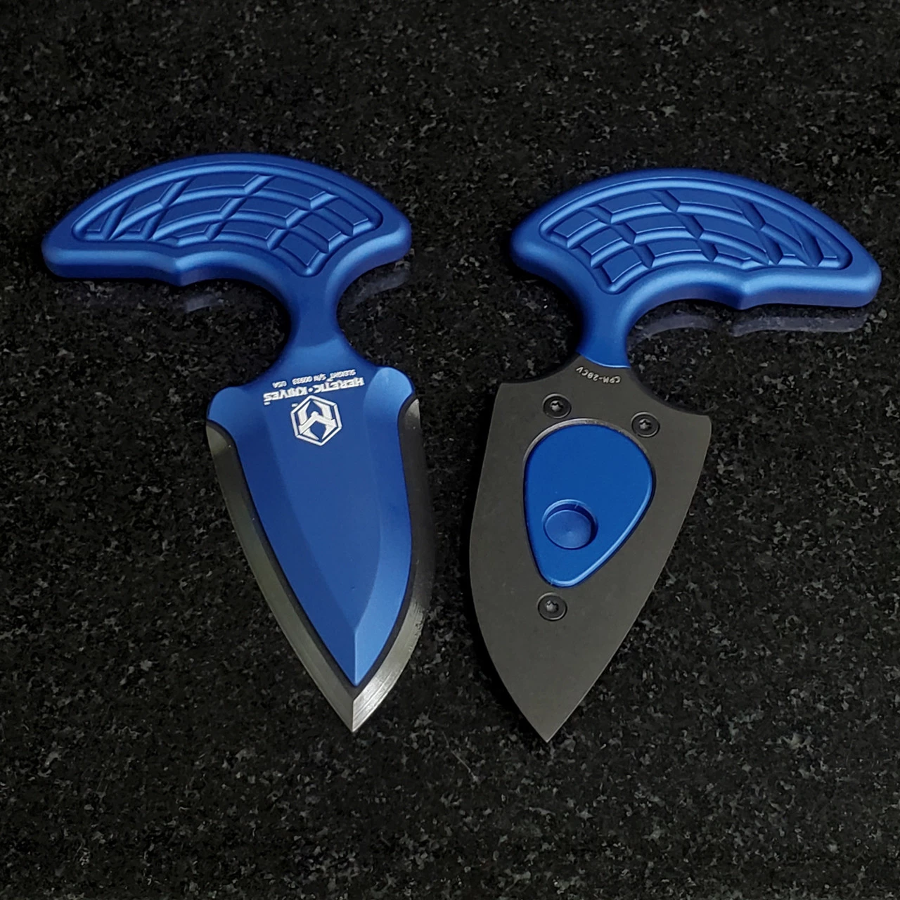 Heretic Sleight Push Dagger Fixed Blade (H050-6A-BLU) – 2.8″ CPM-20CV Black DLC Double Edge Dagger, Blue Anodized 6061-T6 Aluminum Handle, Black Kydex Sheath with Tek-Lok