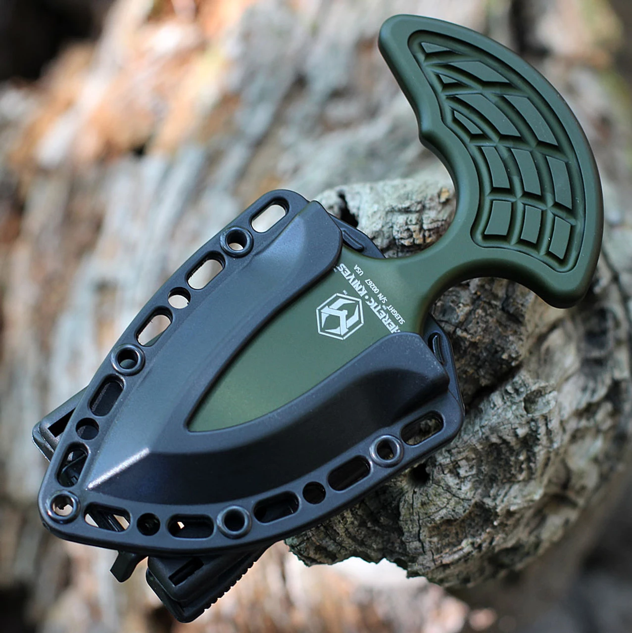 Heretic Sleight Push Dagger Fixed Blade (H050-5A-GRN) – 2.8″ CPM-20CV Battleworn Stonewash Double Edge Dagger, Green Anodized Aluminum Handle, Black Kydex Sheath with Tek-Lok