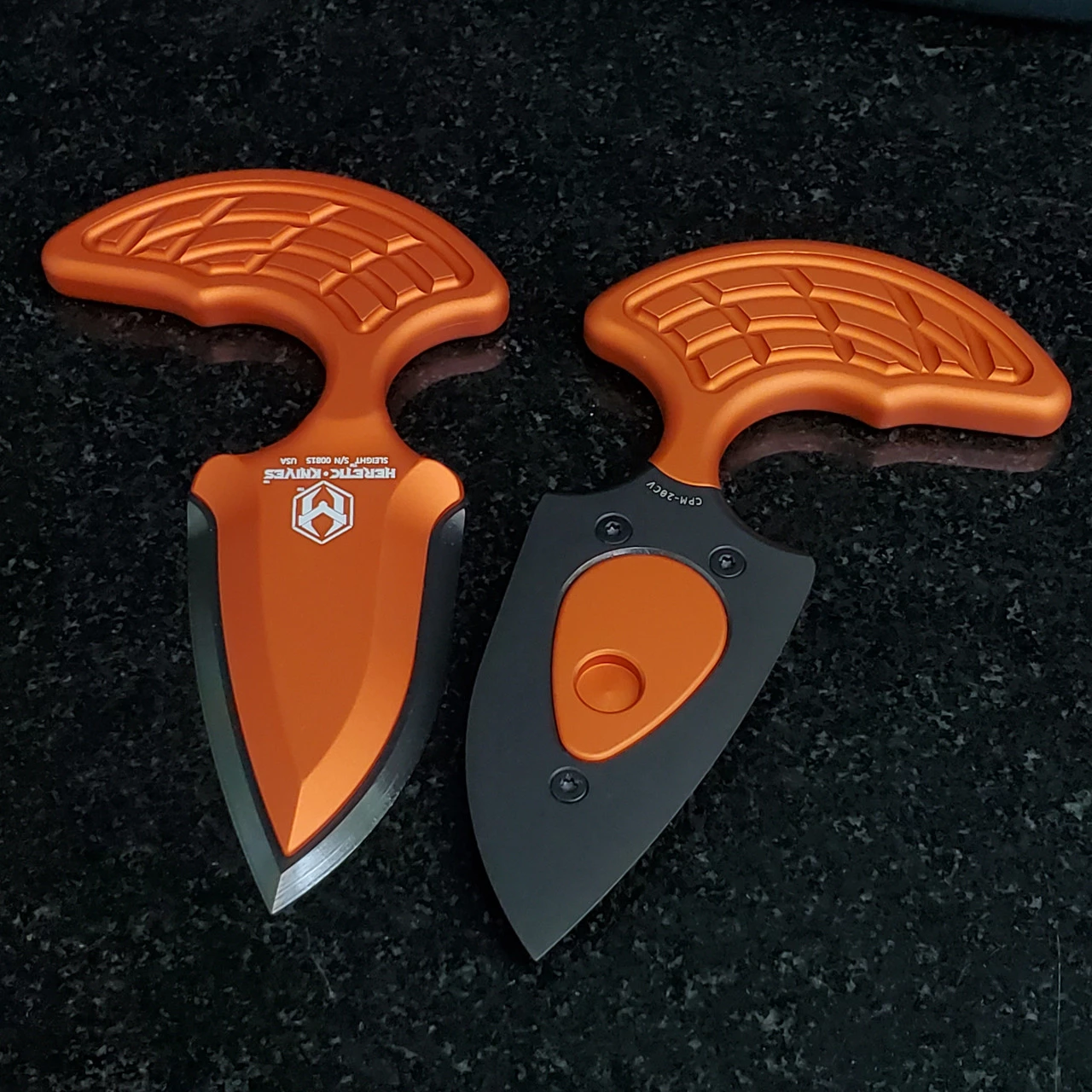 Heretic Sleight Push Dagger Fixed Blade (H050-6A-ORG) – 2.8″ CPM-20CV Black DLC Double Edge Dagger, Orange Anodized 6061-T6 Aluminum Handle, Black Kydex Sheath with Tek-Lok