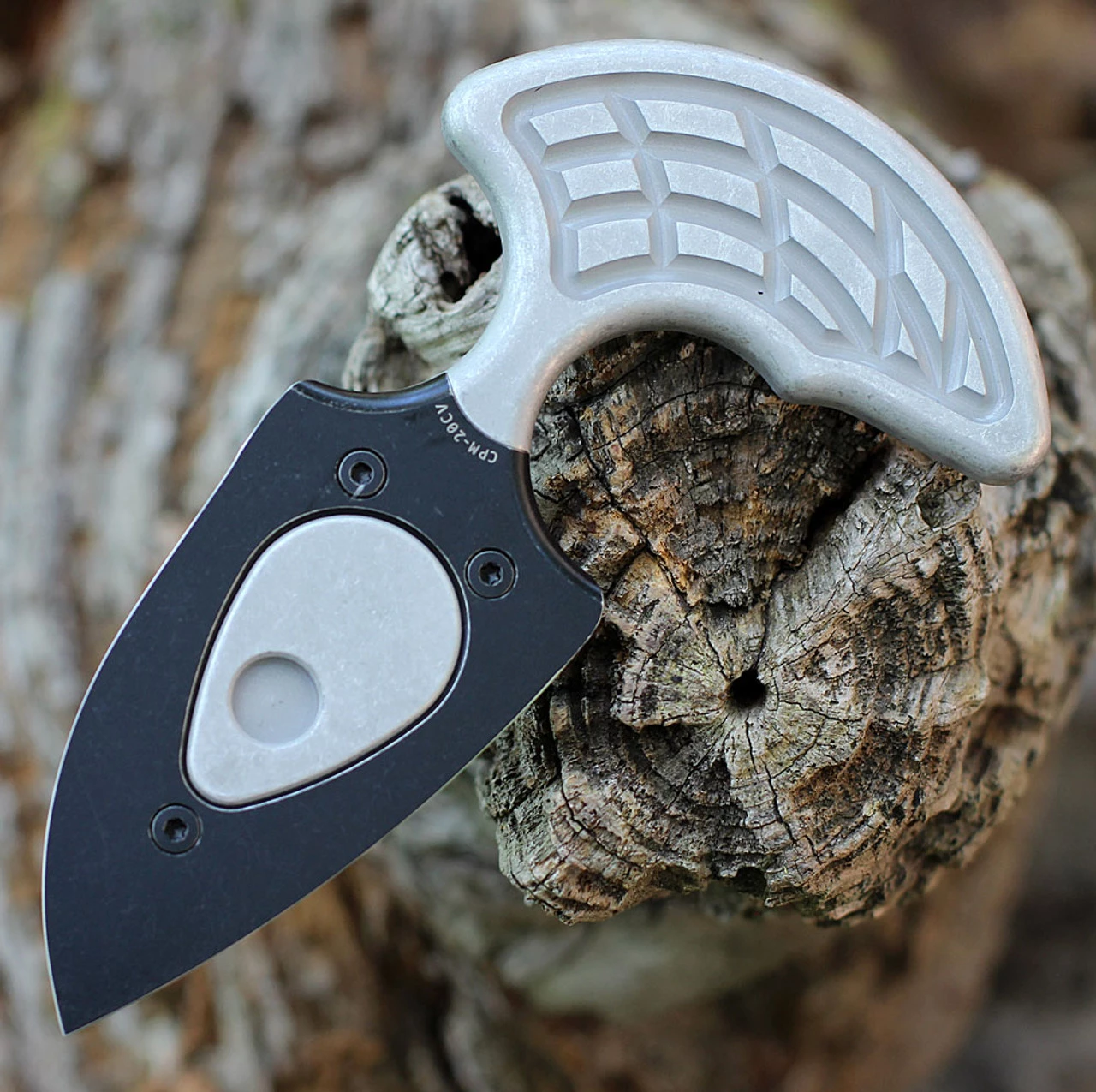Tony Jr. unveils his first modular push dagger, the Heretic Sleight. Powered by a chisel ground double edge standard blade (CPM-20CV) with an edge length of 2.8″, the overall lenght is 5.40″ and 3.2 ounces without a sheath. The Sleight is a modular tool, so simply remove the three T8 screws and swap your blade with a Sleight knife handle (sold separately) or switch to another Sleight accessory. Â