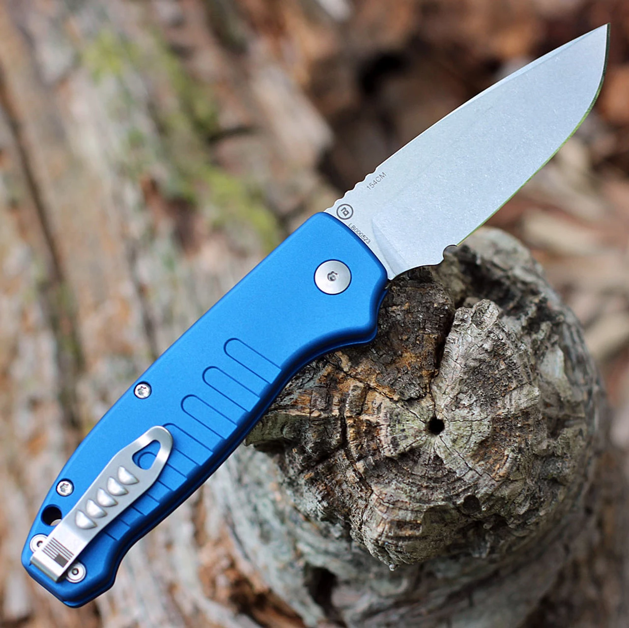 Hogue Ballista I Automatic (64133) – 3.5″ 154CM Satin Drop Point Blade, Blue Aluminum HandleÂ