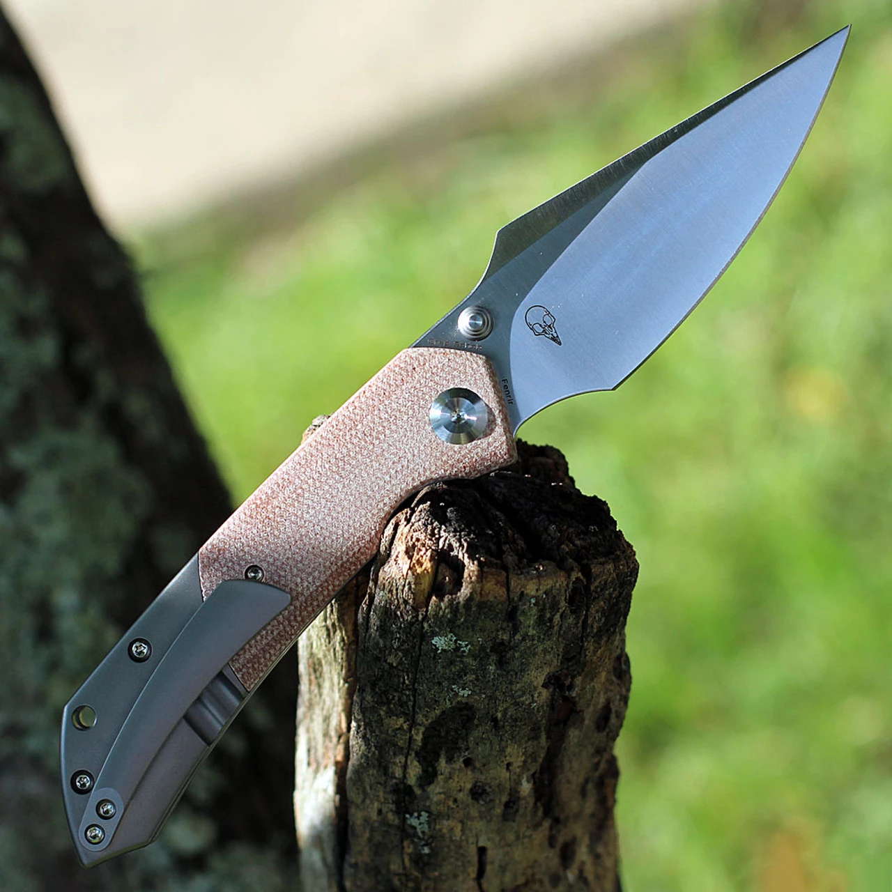 - Brown Micarta handle scales with rear titanium bolsters.