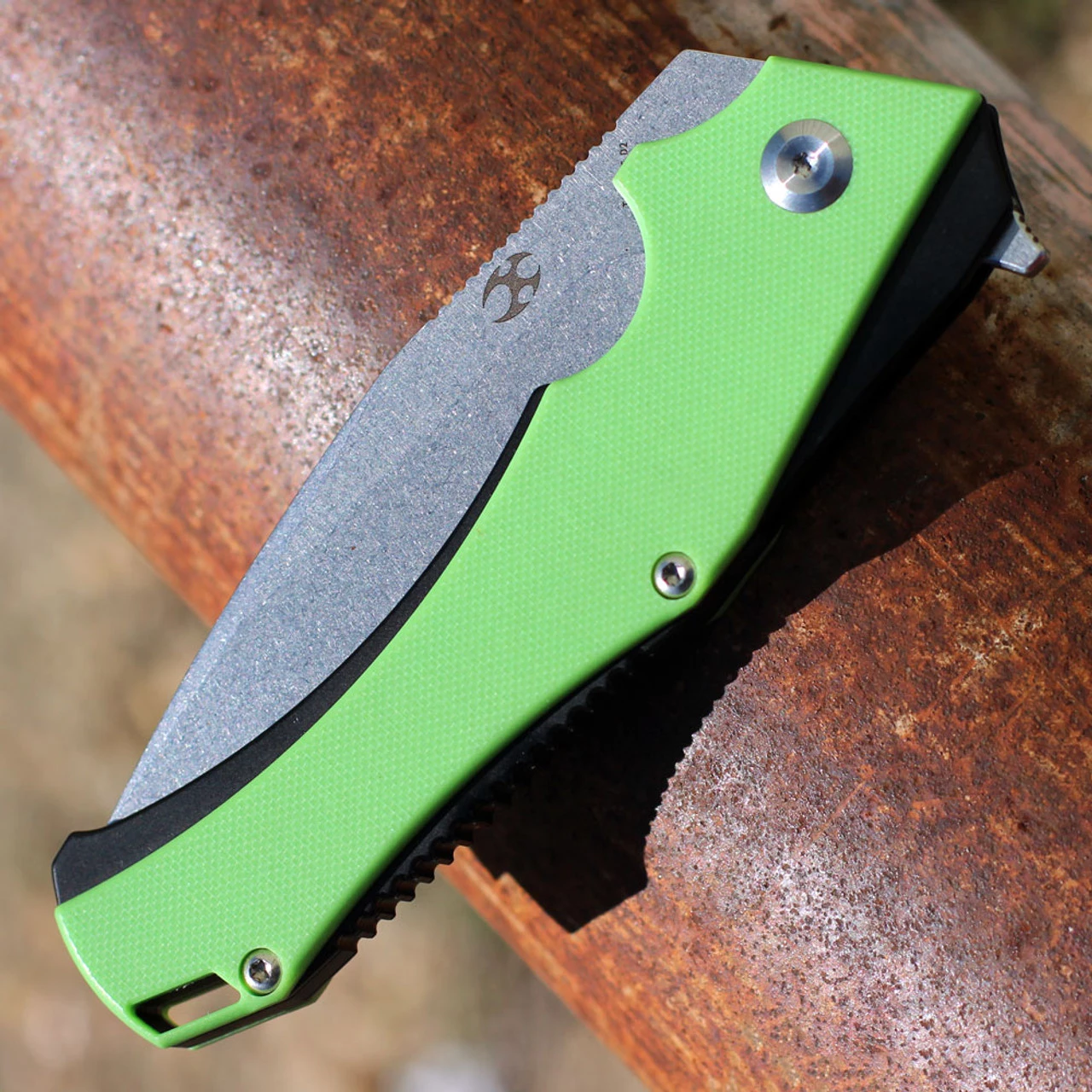 Kansept Hellx Folding Knife (T1008A5) – 3.6″ D2 Stonewashed Drop Point Blade, Lime Green G10 Scales, Black Stainless Steel Handle
