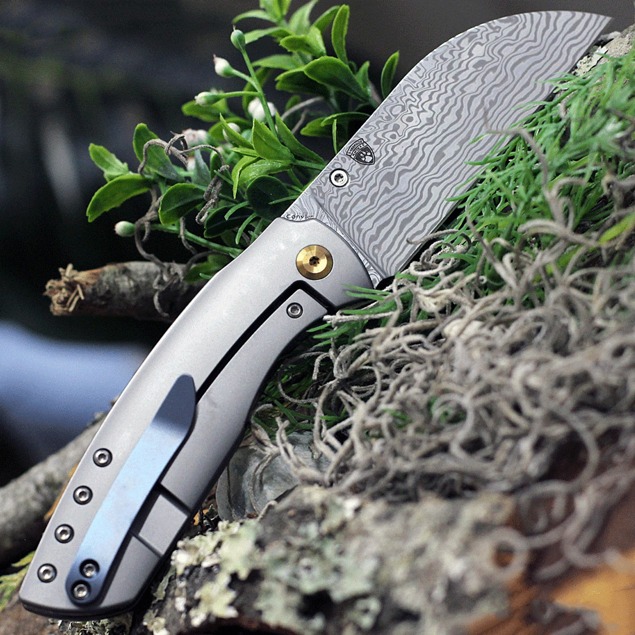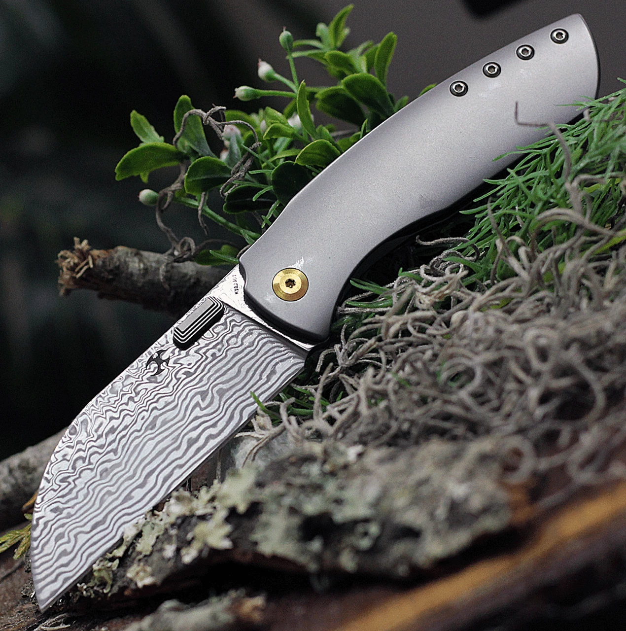 Kansept Knives Convict K1023D1, 3.3″ Damascus Steel Sheepfoot Blade, Gray Titanium Handle