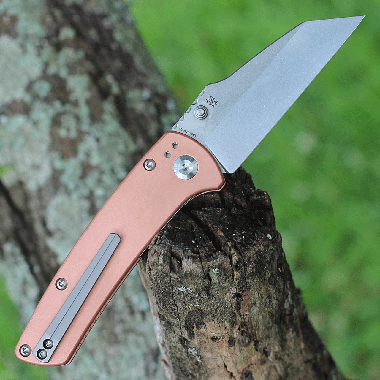 The Main Street, designed by Dirk Pinkerton, is a pocket knife that illegible for utility tasks. The blade has a wharncliffe shape that pierces and slices with ease. It is a budget-friendly model with copper handle and 154 CM blade.