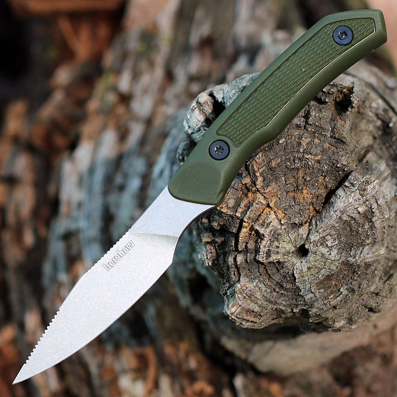 Kershaw Deschutes Caper Fixed Blade (1882) – 3.3″ D2 Stonewash Clip Point Blade, Olive Polypropylene Handle, Black Glass-Filled Nylon (GFN) Sheath