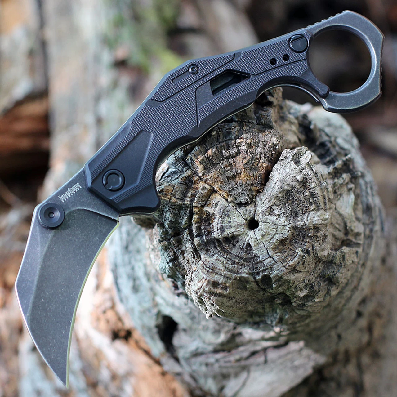 ring a tactical edge to your loadout a Kershaw karambit blade. The Outlier’s steel backspacer includes jimping to fit a variety of grips, with or without the ring. A reverse grip, for example, is easily achieved with the Outlier. The eye-catching blade shape is not only tactical, but it’s also utilitarian for cutting boxes or rope. For ultra-quick access, the flipper or thumb stud can be used with Kershaw’s assisted opening mechanism. This tough Kershaw features a BlackWash™ finish on the blade and steel ring. Quick and secure, the Outlier is everything you want in a karambit.