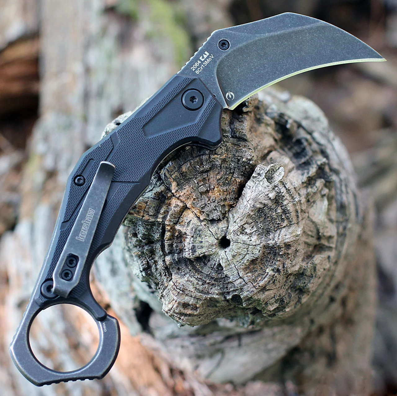 Kershaw Outlier Assisted Karambit Flipper (2064) – 2.60″ 8Cr13MoV Black-oxide Blackwash Hawkbill Blade, Black FRN Handle