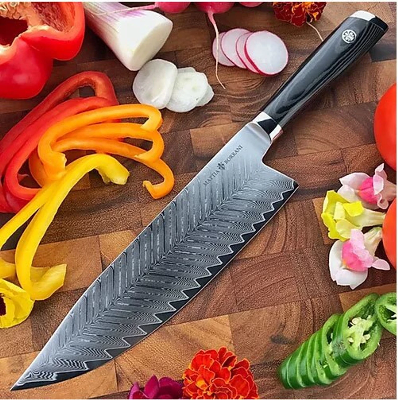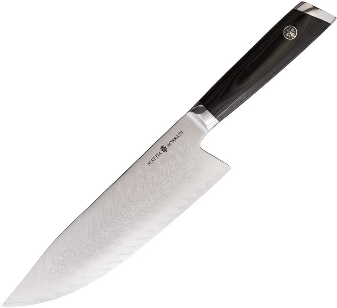 The Bowie knife. Utilizing its big belly and edge geometry along with full tang construction, the 8.2″ Bowie Chefâ„¢ is an indispensable all-purpose kitchen knife that is perfect for slicing, dicing, chopping, and rocking cuts. The clip point on this knife is purposeful and unique in that it facilitates higher rocking cuts due to the point being slightly higher than conventional chef knives, allowing a more fluid motion while chopping. Due to the balance and weight of the knife, it is also excellent for heavier duty work such as cutting larger vegetables and proteins.
