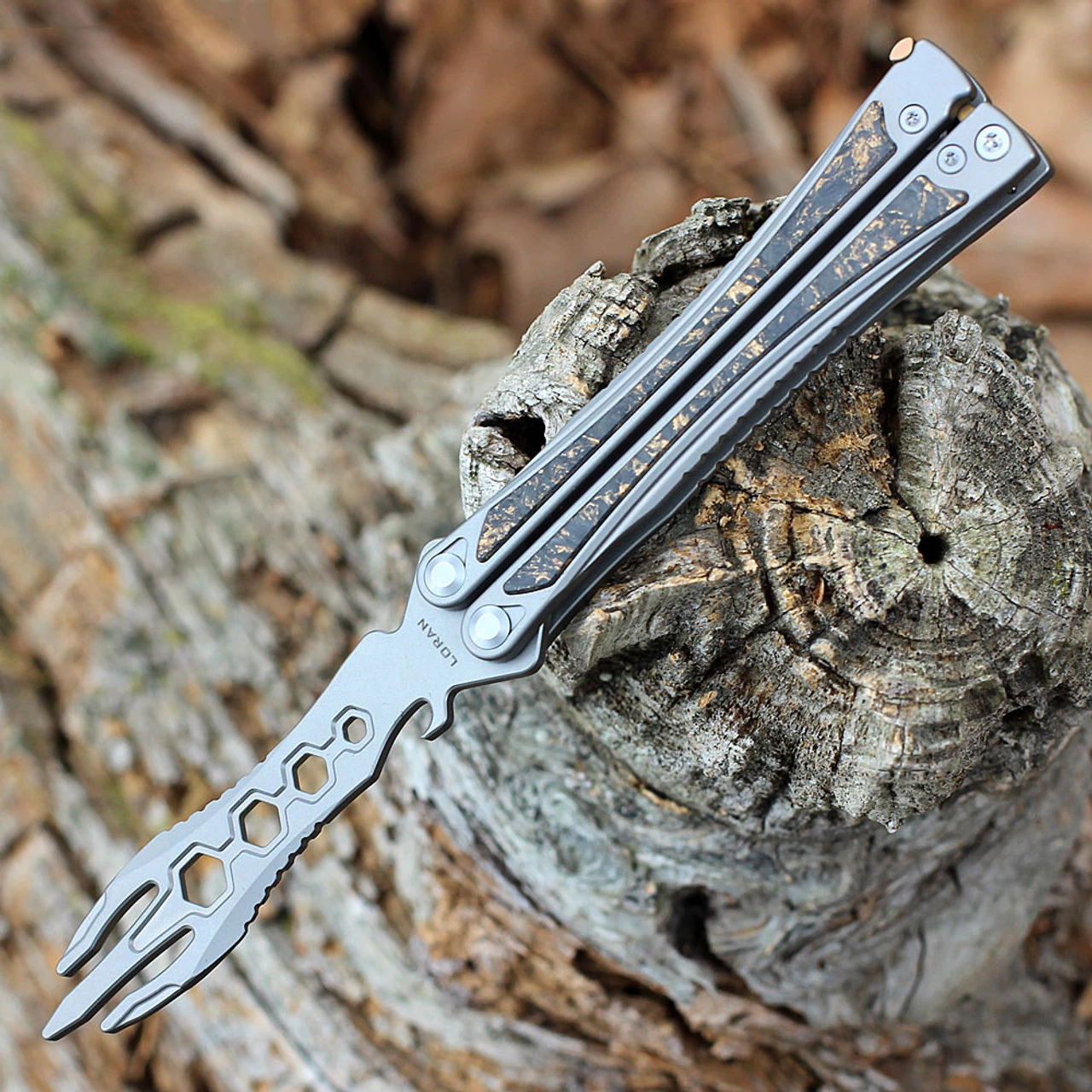 Maxace Loran MINI Bailsong (MLR01) – 3.3″ M390 Double Edge Blade & Wrench Multi-Tool Trainer Blade, Gray Titanium Handle with Gold Carbon Fiber Inlay