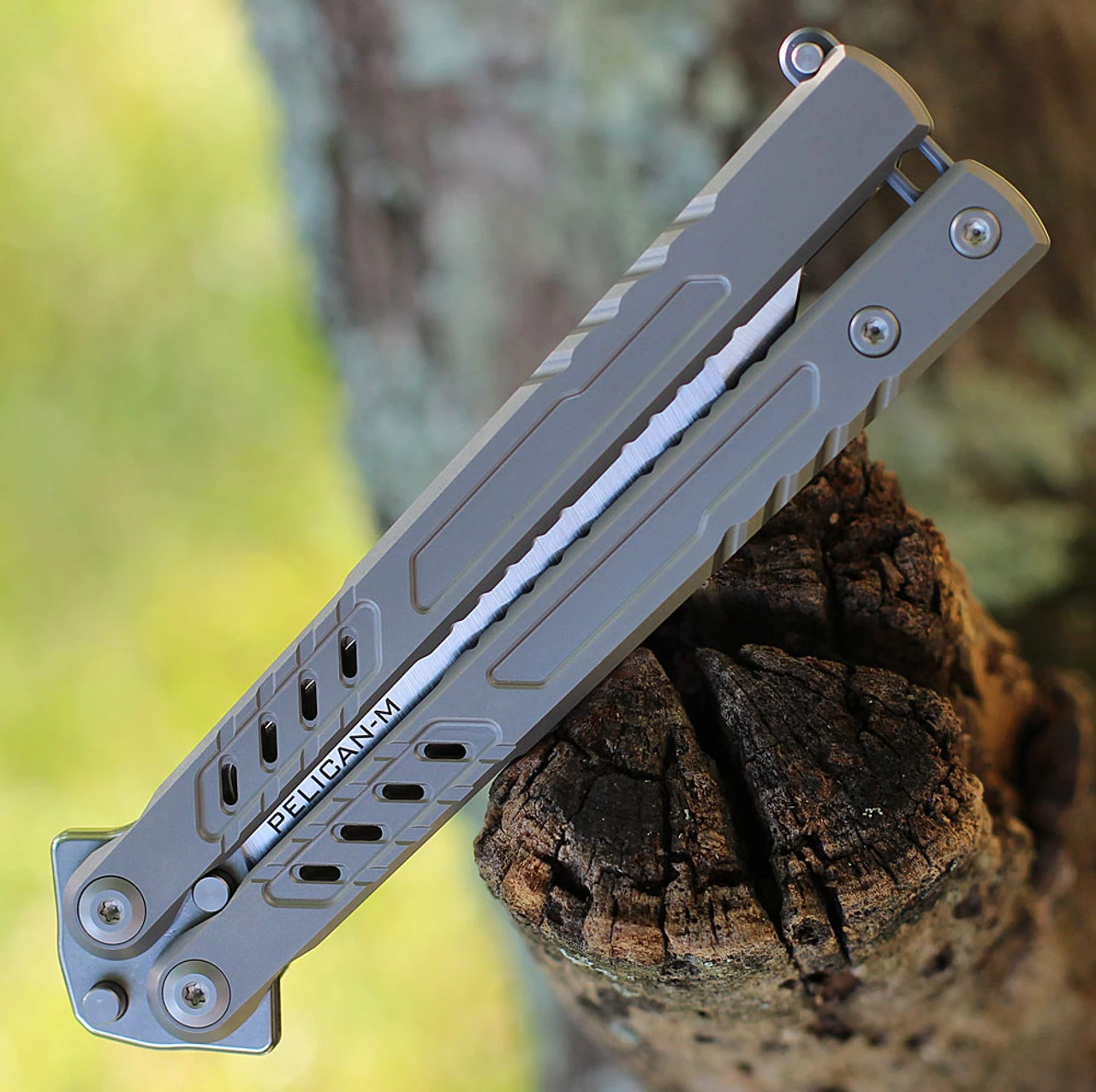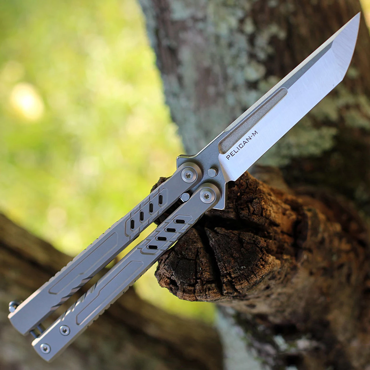 Maxace Pelican-M Balisong Butterfly Knife (MCPM01) – 3.54″ Bohler M390 Satin Tanto Blade, Grey Titanium TC4 Handle W/ 440C External Tuning Fork Trainer BladeÂ
