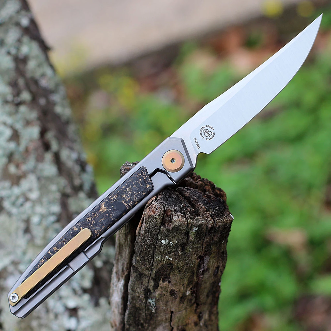Maxace Knives Persian Front Flipper (MCPS01) – 3.85″ Satin M390 Straight Back Blade, Gray Titanum Handle with Carbon Fiber Inlay