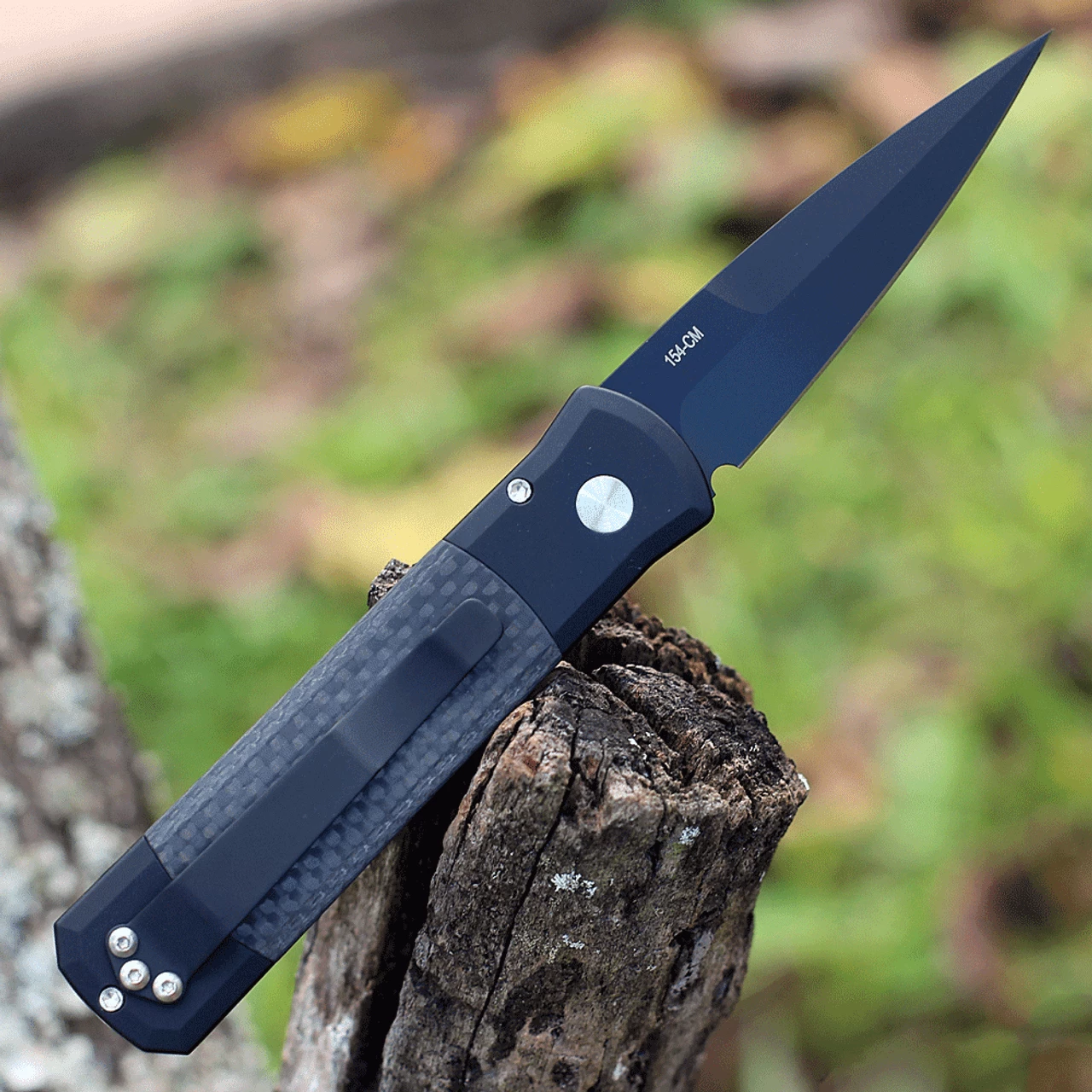 Pro-Tech Knives Godson Automatic (705) – 3.15″ 154CM DLC Black Spear Point Blade, Black Aluminum Handle with Carbon Fiber Inlay