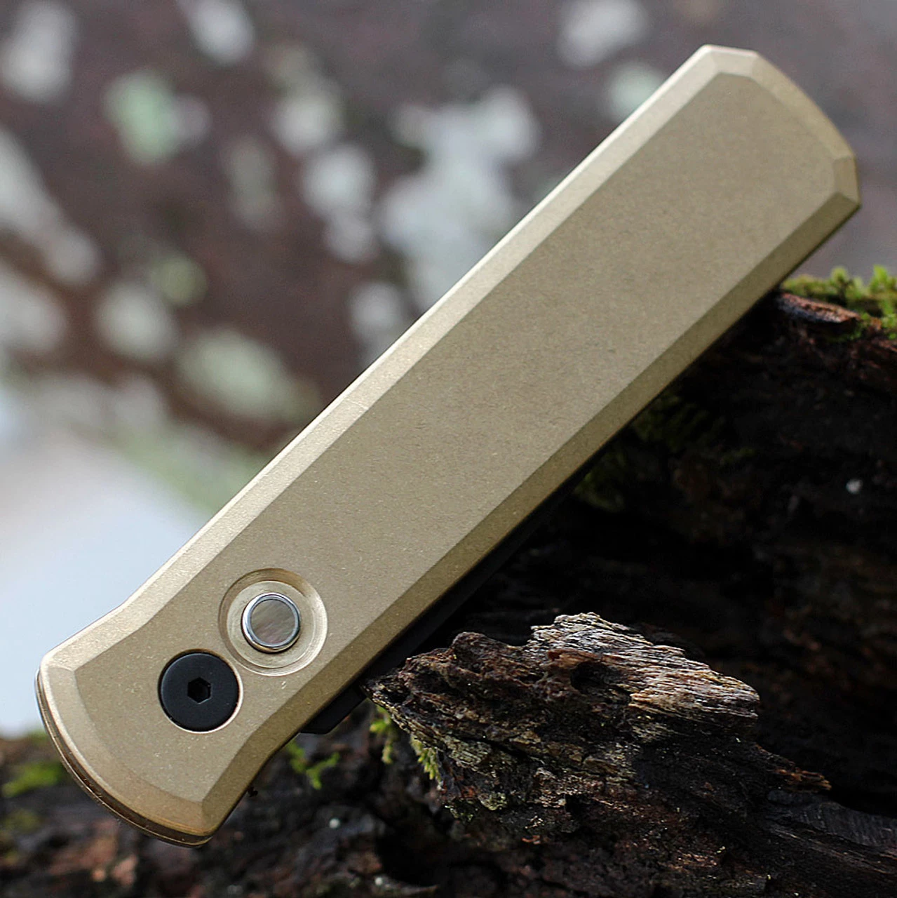 Pro-Tech Godson Automatic Knife (7112) – 3.15″ Black DLC 154CM Spear Point Blade, Stonewashed Bronze Aluminum Handle with Black Mother of Pearl Button