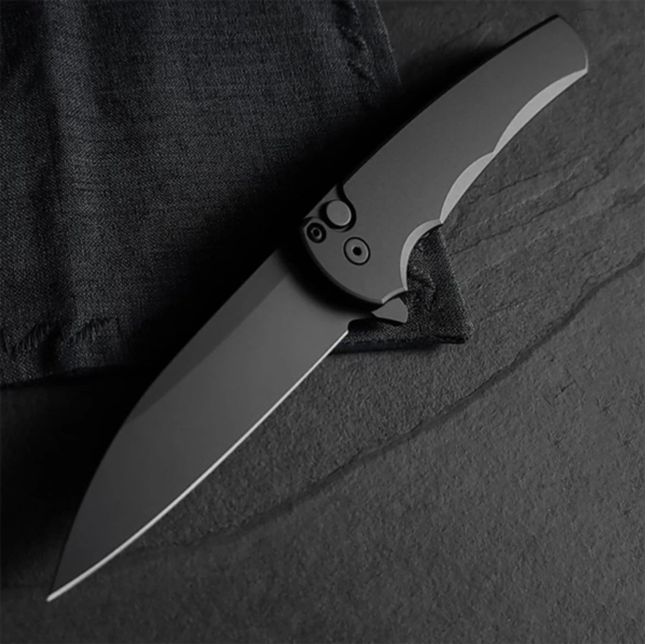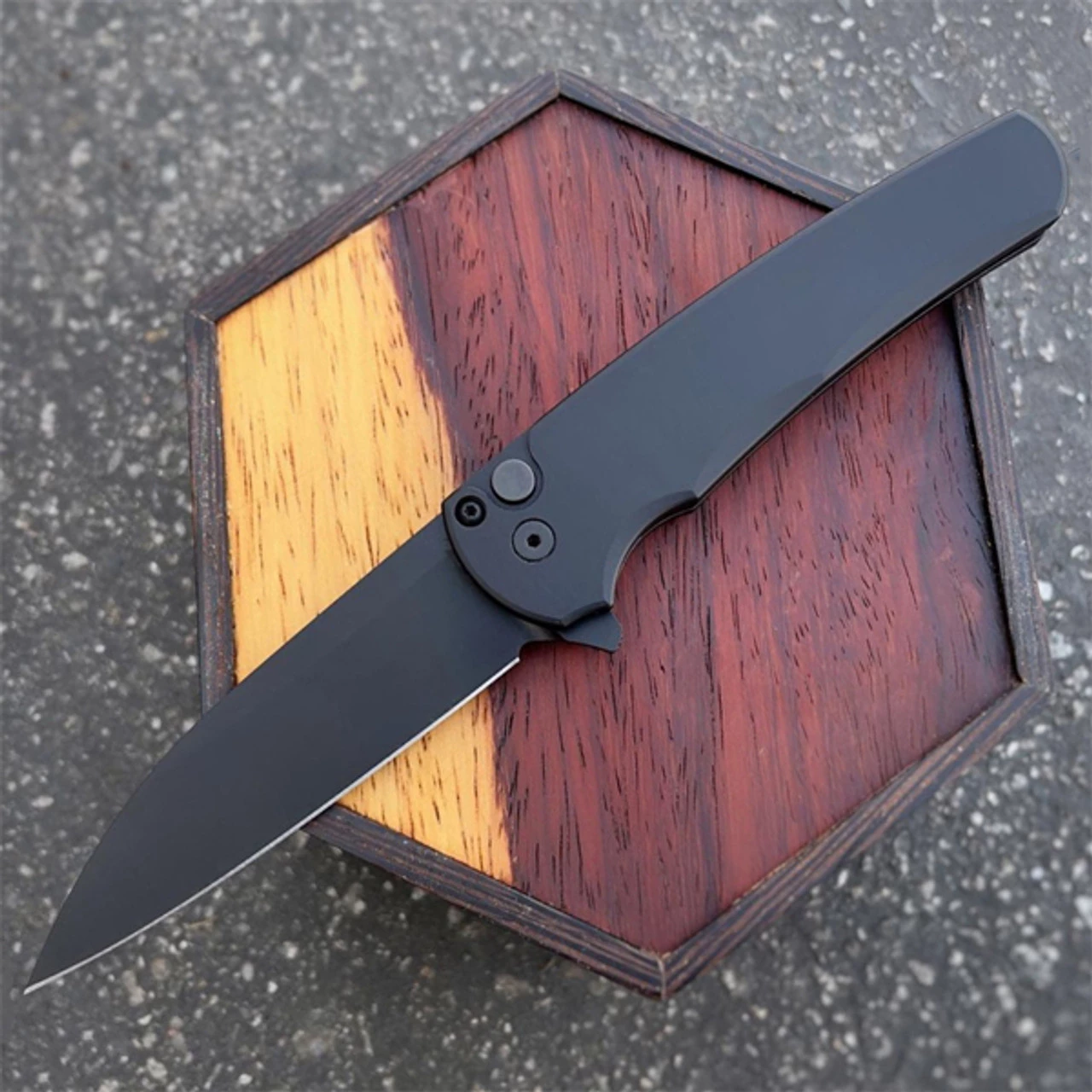 Pro-Tech Malibu Button Lock Flipper (5103) – 3.25″ CPM-20CV DLC Black Wharncliffe, Black Aluminum Handle
