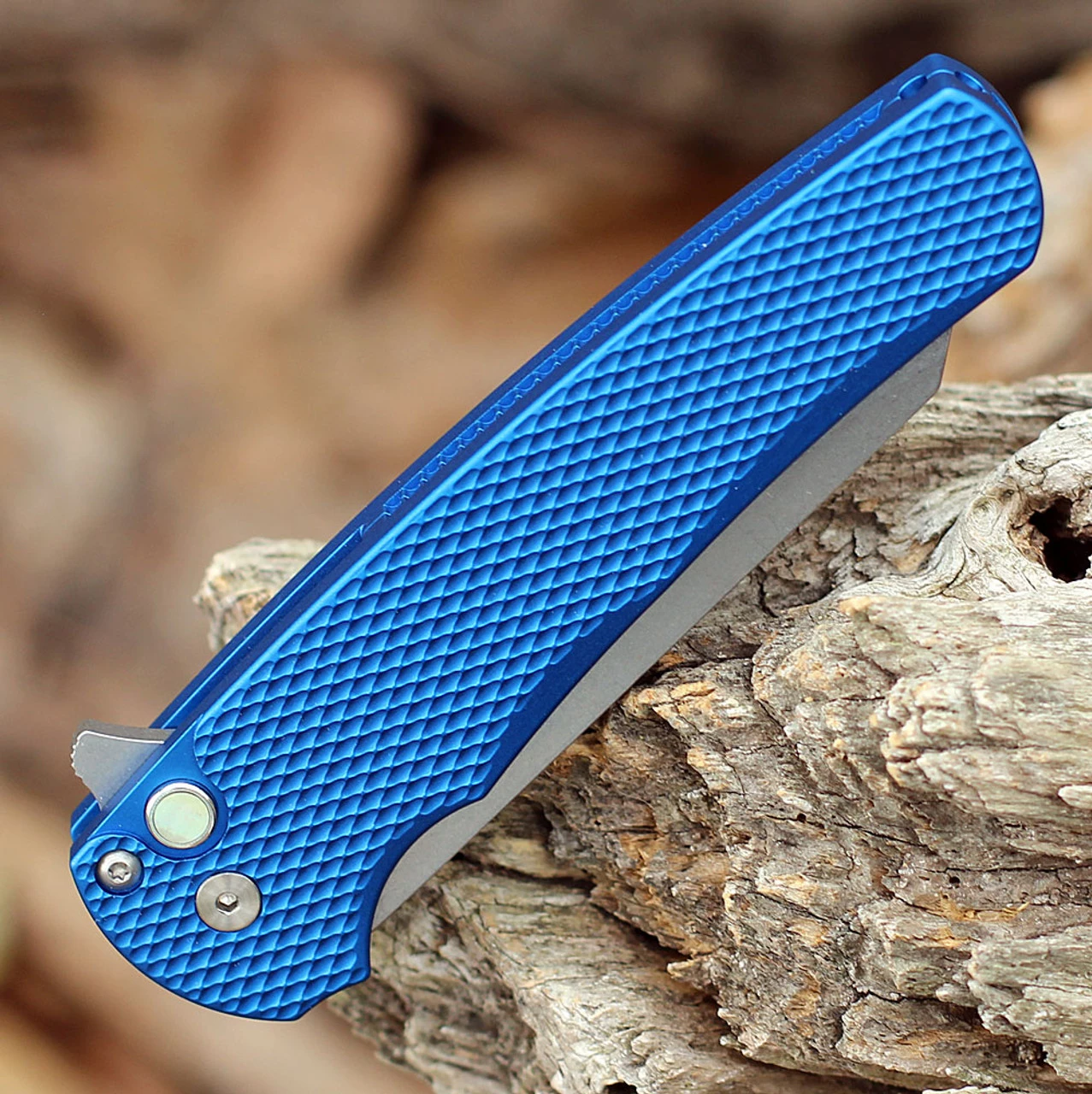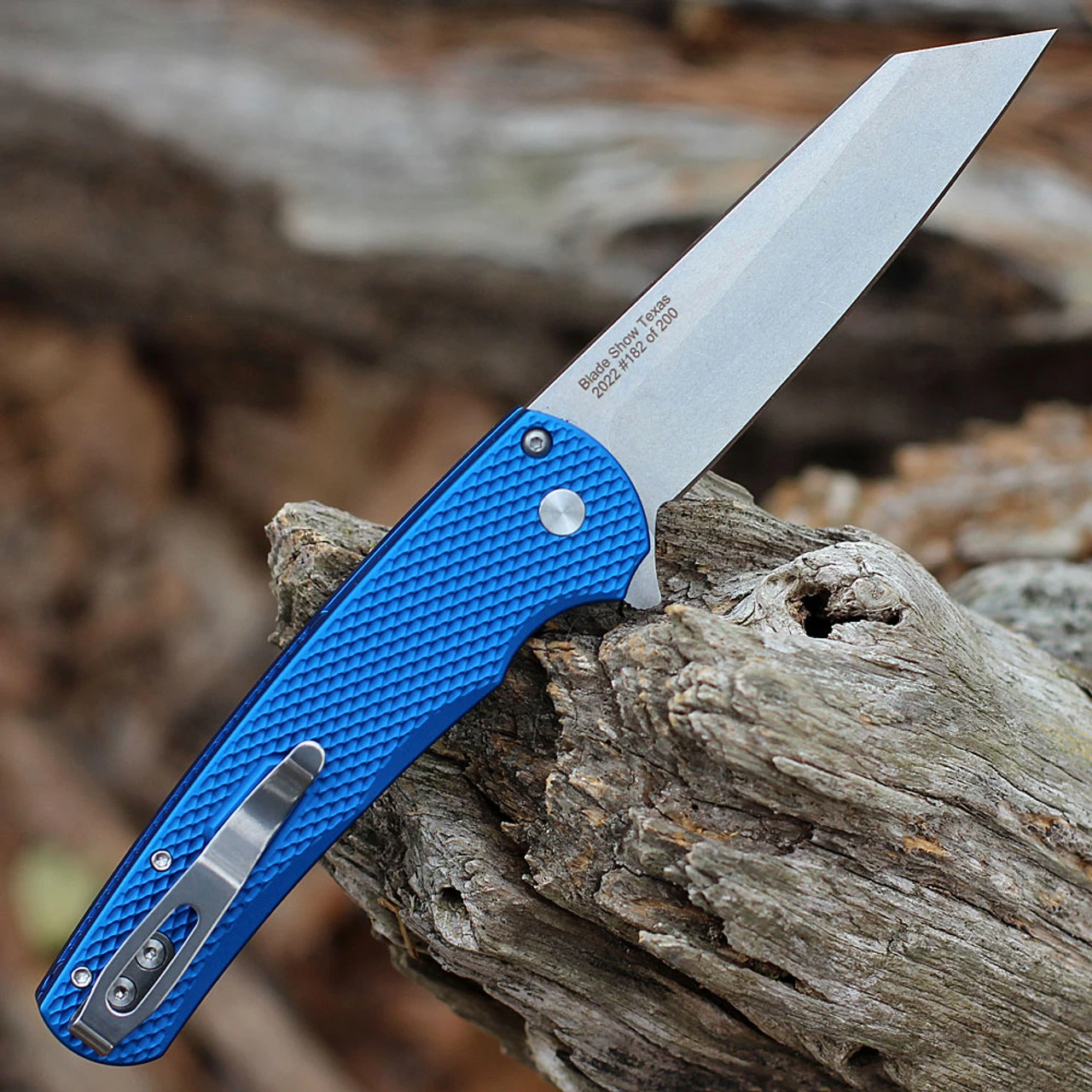 Pro-Tech Knives Malibu “Blade Show Texas” (5205-BLUE) – 3.25″ CPM-20CV Stonewashed Reverse Tanto, Blue Textured Aluminum Handle