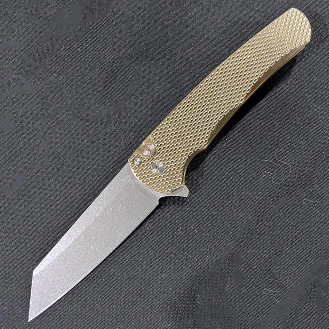 Pro-Tech Malibu Button Lock Flipper (5211) – 3.25″ CPM-20CV Stonewash Reverse Tanto, Textured Bronze Alu Handle, Mosaic Pin Push Button, Satin Hardware and Polished Clip
