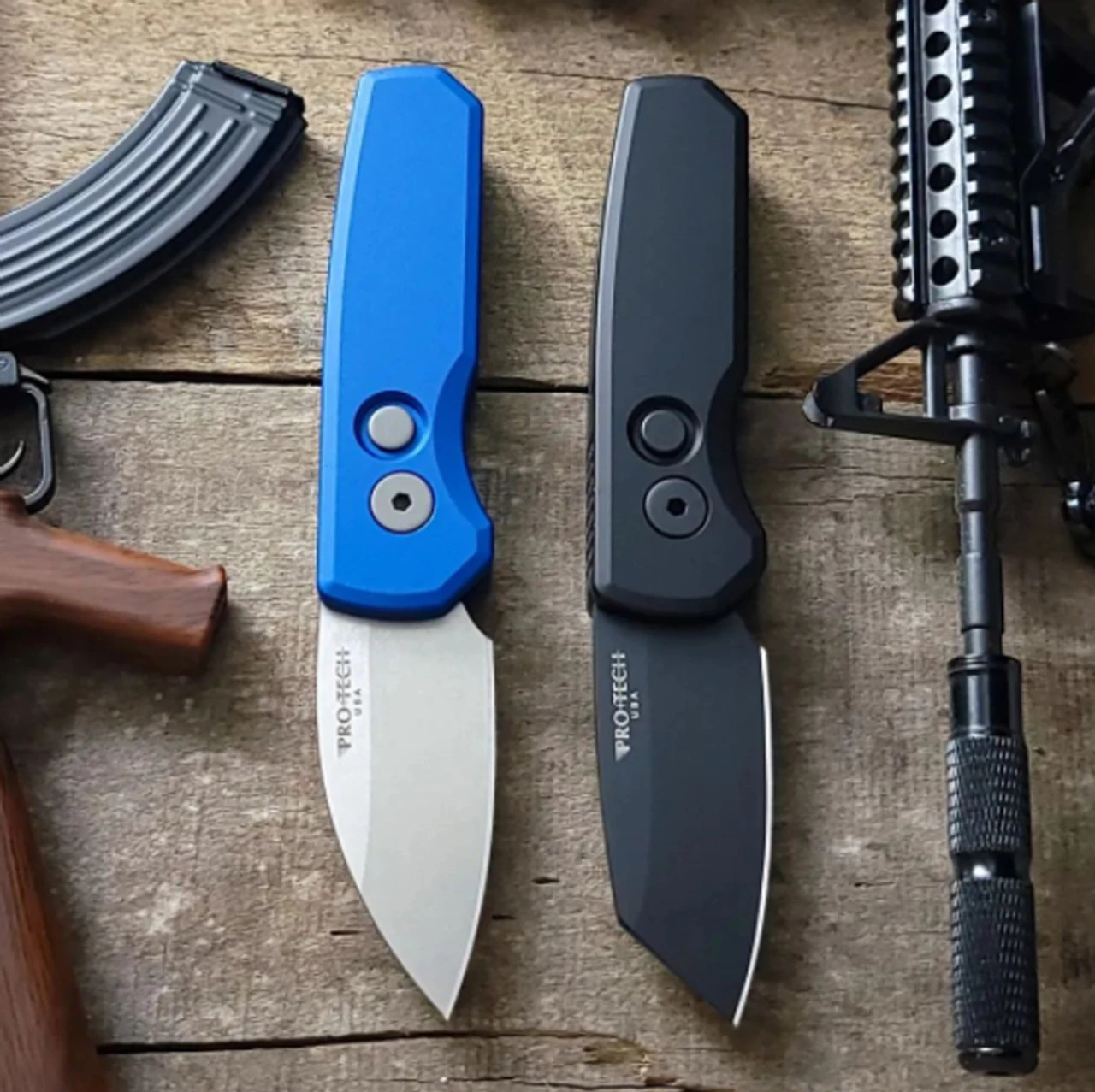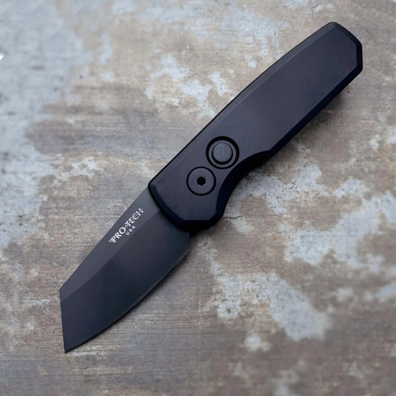 Small but mighty, the Runt 5 opens with fierce authority and has excellent cutting edge with its aggressive reverse tanto blade. If you’re looking for a tough knife that’s compact while retaining a comfortable ergonomic grip, this is it! This new Runt 5 automatic knife features smooth black anodized aluminum handles, a California legal reverse tanto blade made of CPM-20CV black hardware, DLC coated mini deep carry pocket clip, and the powerful Pro-Tech auto action.