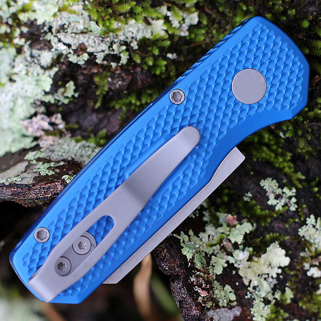 Small but mighty, the Runt 5 opens with fierce authority and has excellent cutting edge with its aggressive reverse tanto blade. If you’re looking for a tough knife that’s compact while retaining a comfortable ergonomic grip, this is it! This new Runt 5 automatic knife features textured blue anodized aluminum handles, a California legal reverse tanto blade made of CPM-20CV, blasted hardware, coated mini deep carry pocket clip, and the powerful Pro-Tech auto action.
