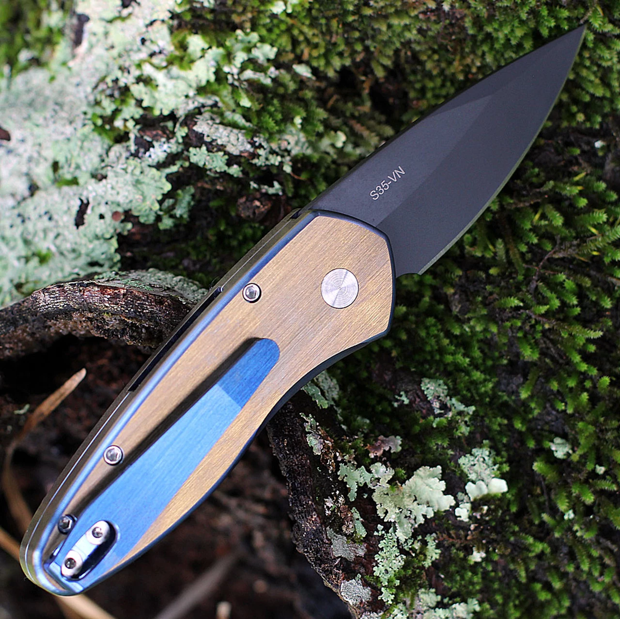 Pro-Tech Sprint Custom Automatic (2952) – 3.00″ S35VN Black DLC Spear Point Blade, Solid Titanium Frame with 3D CNC Engraved Pattern, Pearl Inlay Button, Titanium Clip