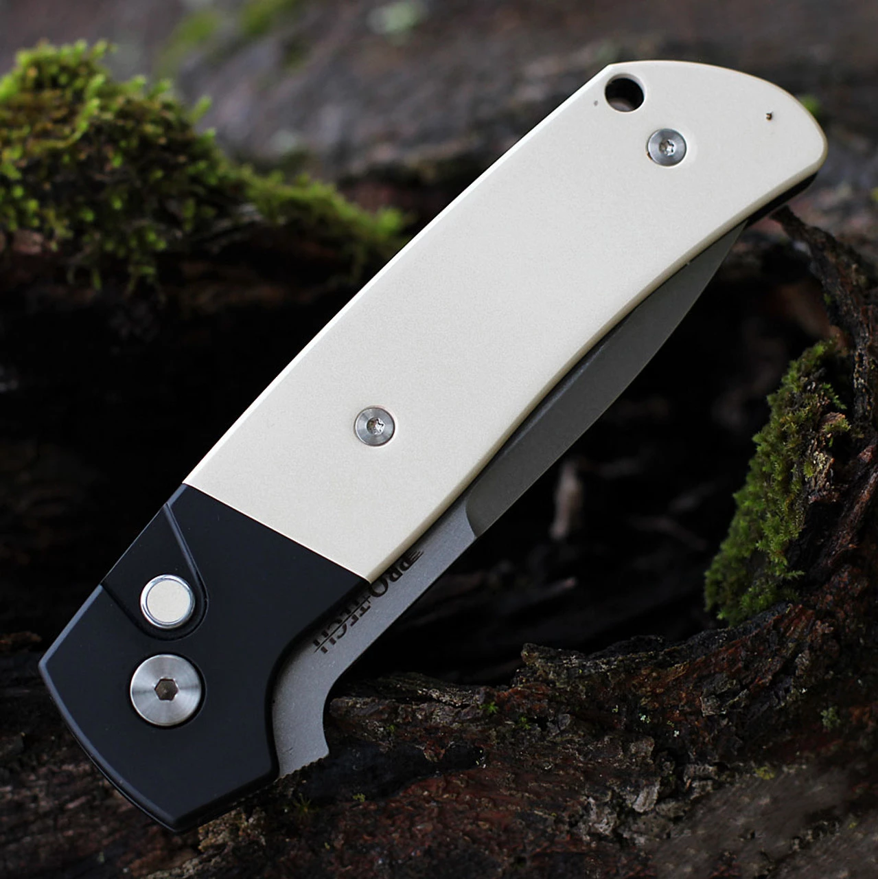Pro-Tech Terzuola ATCF “Tuxedo” Automatic  (BT2751) – 3.45″ Stonewashed Magnacut Drop Point Blade, Black Aluminum and Smooth Ivory Micarta Handle – First Limited Run 2022