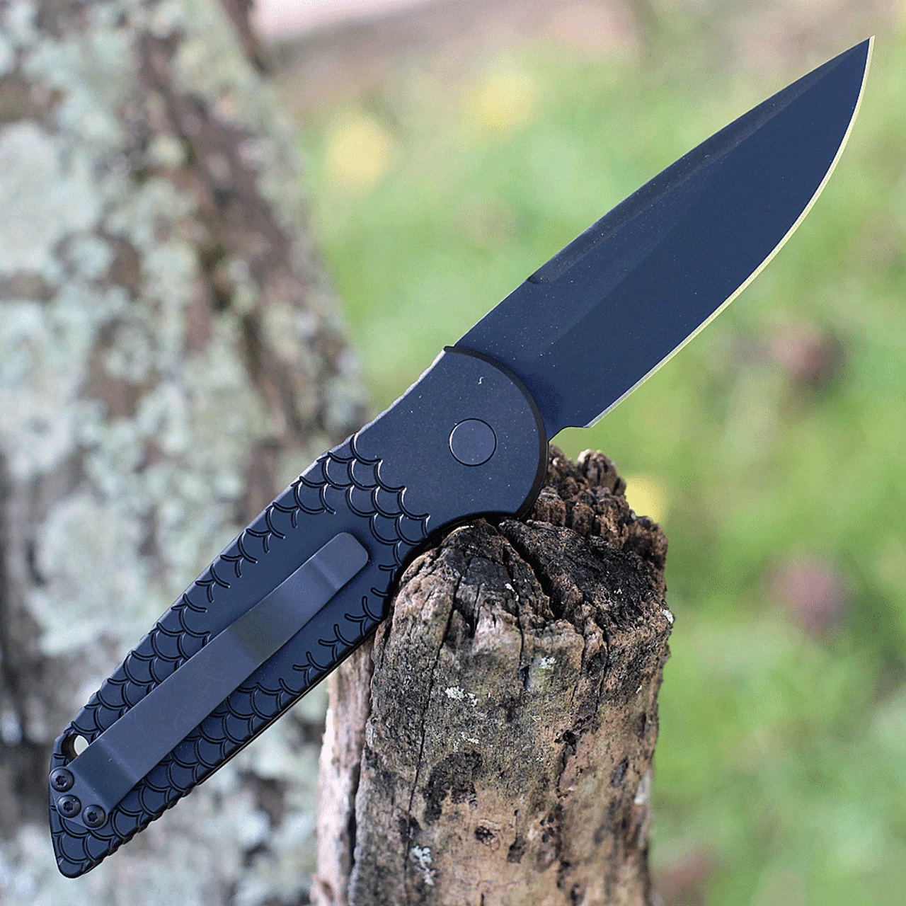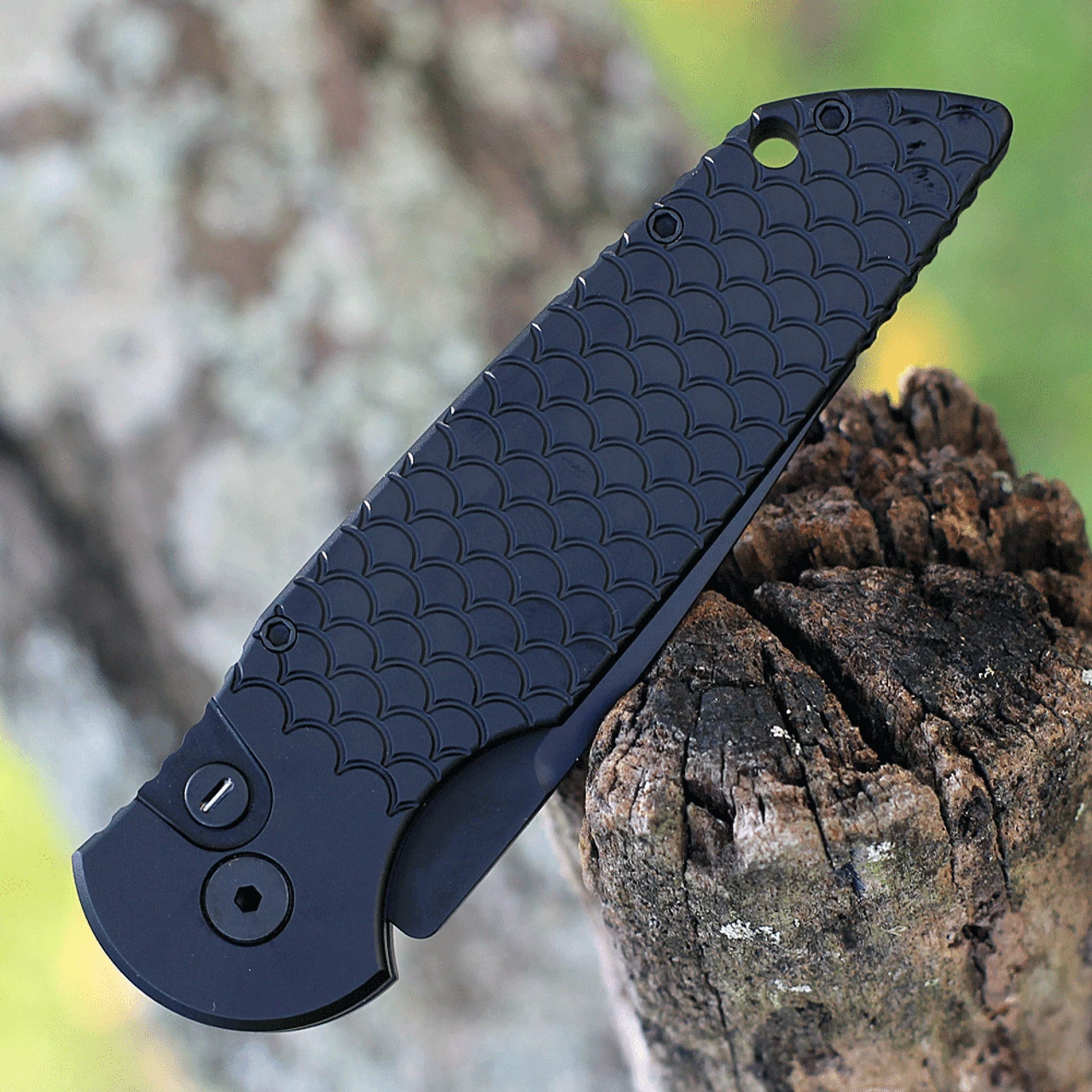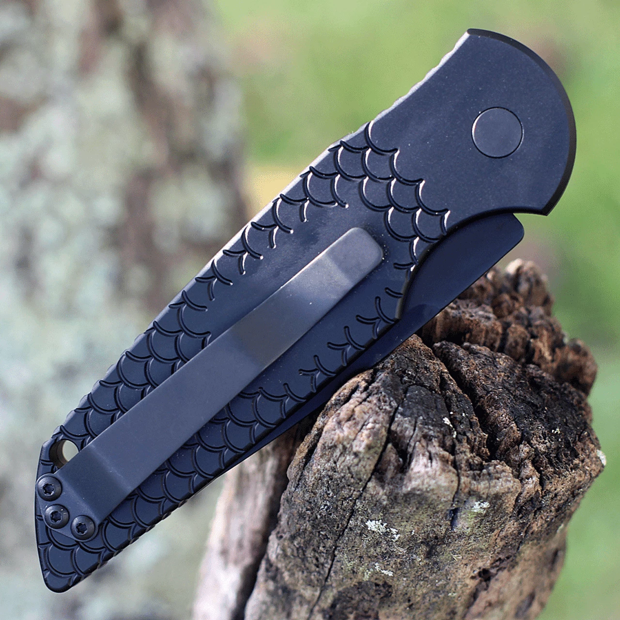 Pro-Tech Knives (TR-3 X1 OP) Tactical Response 3 Operator Automatic Knife, 3.5″ 154cm Sterile Black Clip Point Plain Blade, Black “Fish Scale” Engraved Aluminum Handle with Tritium Push Button