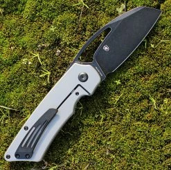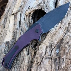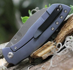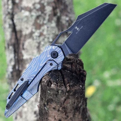 Kansept Knives Convict K1023W1, 3.3″ Damascus Steel Sheepfoot Blade, Blue Titanium Wood Grain Handle